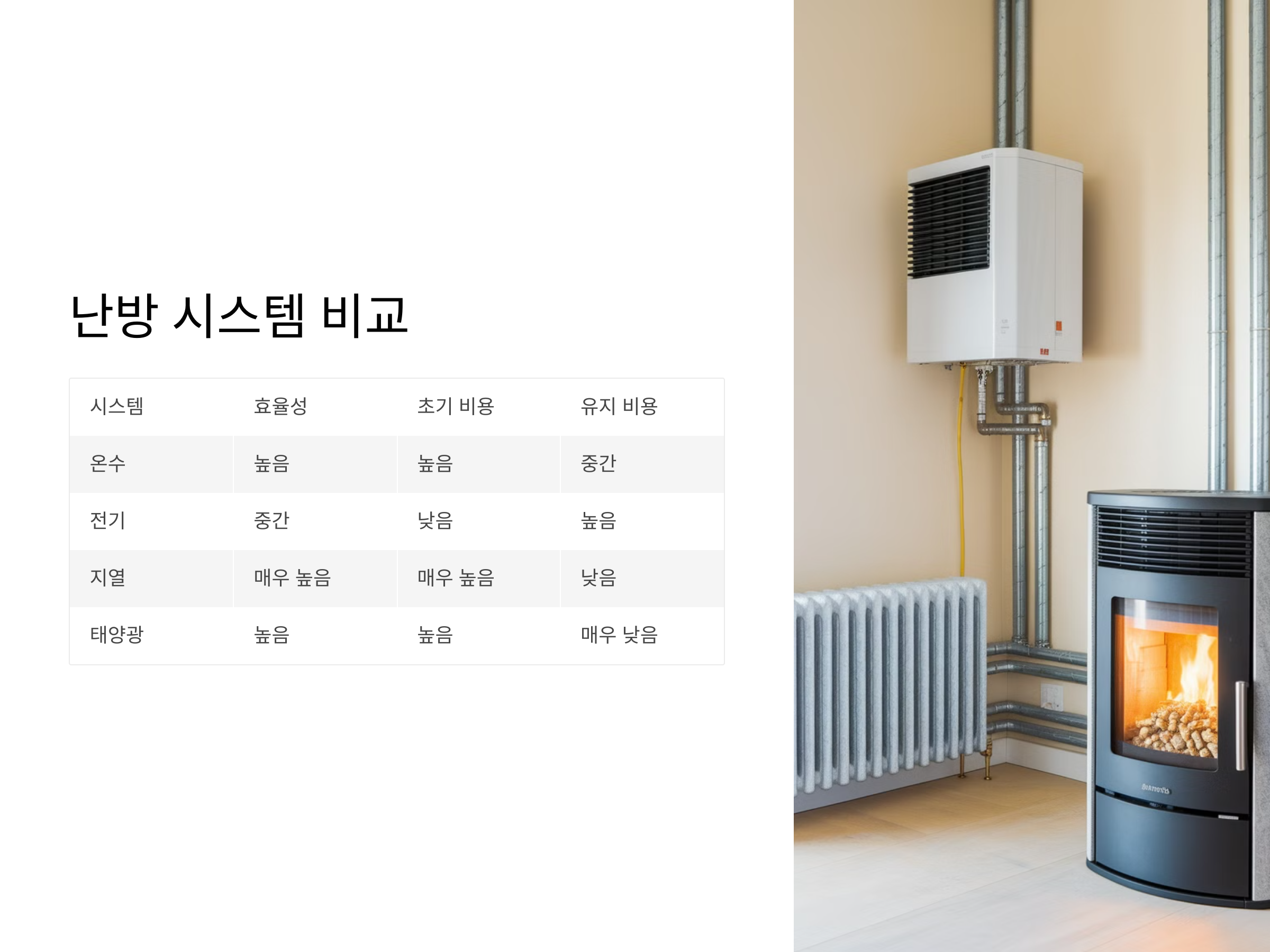 - 공간 확보 필요: 보일러와 배관을 설치할 공간이 필요합니다.