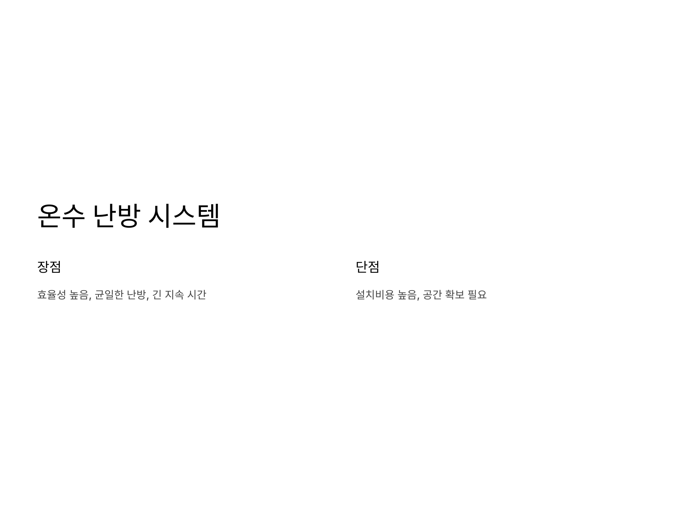 - 일조량에 따른 의존성: 햇볕이 강하지 않으면 난방 효과가 떨어질 수 있습니다.