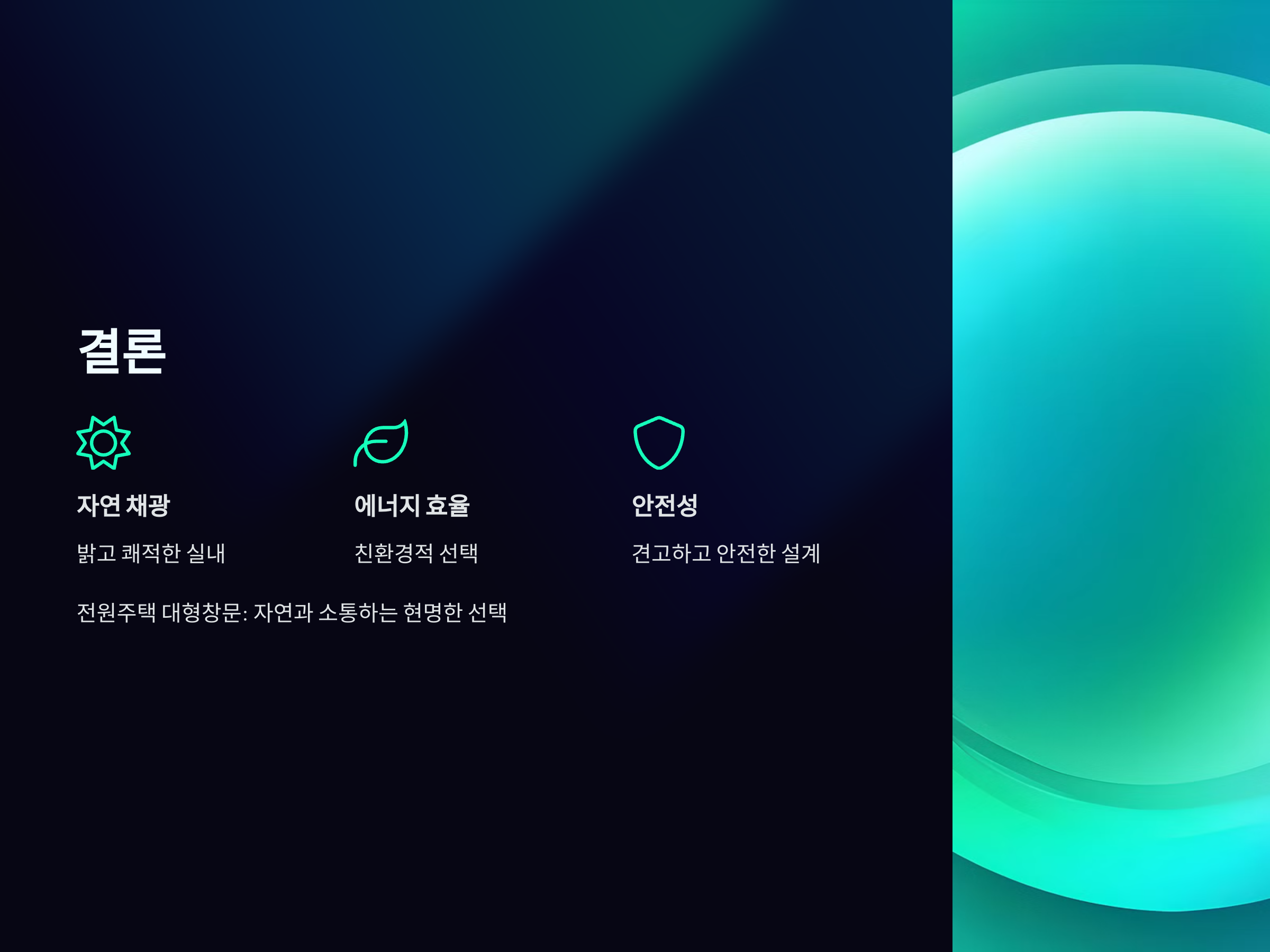 그렇다면, 전원주택에서 대형창문을 설치하면 무엇을 더 기대할 수 있을까요? 첫째, 전원주택의 디자인이 현대적이고 세련되게 바뀝니다. 둘째, 전원주택 내 실내 공간이 더 넓고 개방적으로 느껴지며, 자연의 변화하는 모습을 실시간으로 즐길 수 있습니다. 넷째, 외부와의 경계가 자연스럽게 허물어져, 집이 하나의 자연 속에 녹아드는 느낌을 줍니다.
