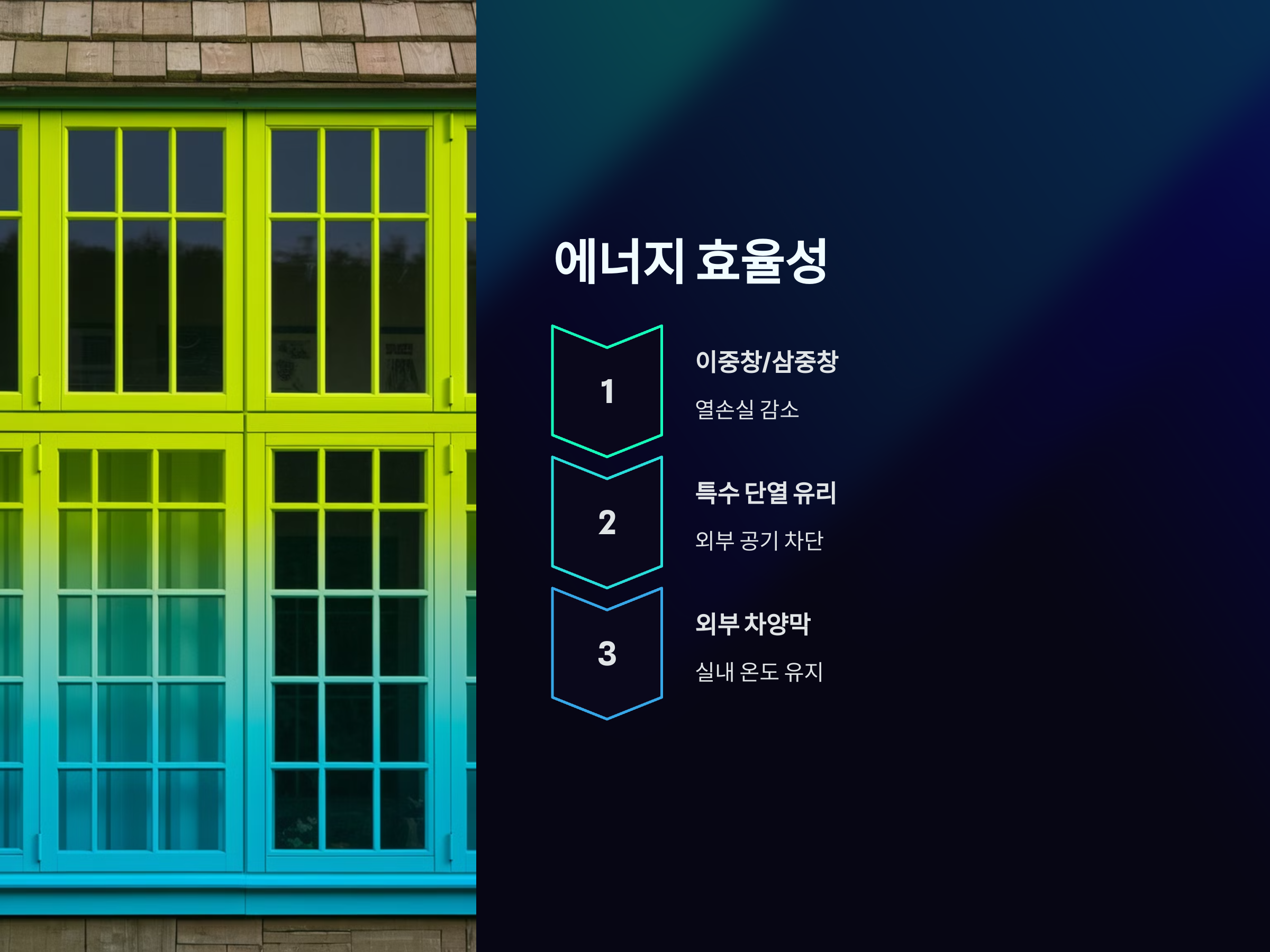 대형창문을 설치할 때 에너지 효율성은 매우 중요한 요소입니다. 대형창문은 자연광을 많이 들여오고, 실내 공간을 시원하고 환하게 만들어주는 장점이 있지만, 겨울철에는 열손실이 커질 수 있습니다. 이 문제를 해결하기 위해서는 이중창, 삼중창 또는 특수 단열 유리를 사용하는 것이 좋습니다. 이러한 유리는 열을 차단하고, 외부의 차가운 공기를 실내로 유입되는 것을 막아줍니다.