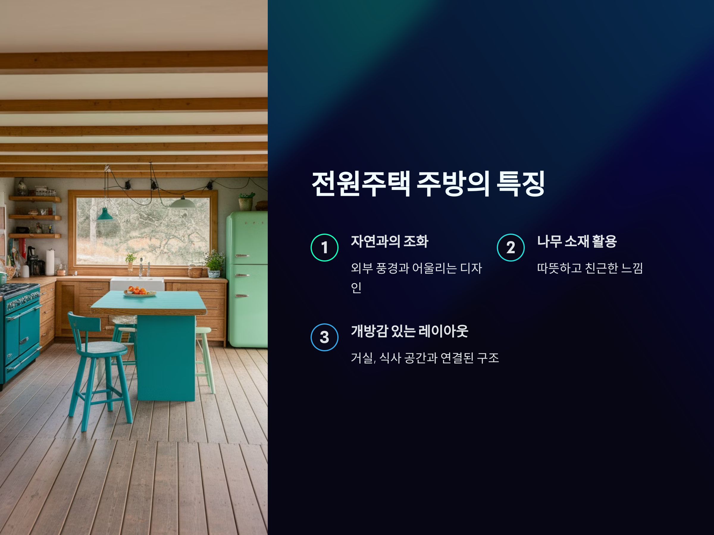 주방 인테리어에서 가장 중요한 요소는 ‘자연과의 조화’입니다. 전원주택의 특성을 살리려면 자연 소재를 사용하고, 외부 환경과 잘 어우러지도록 디자인하는 것이 중요합니다.