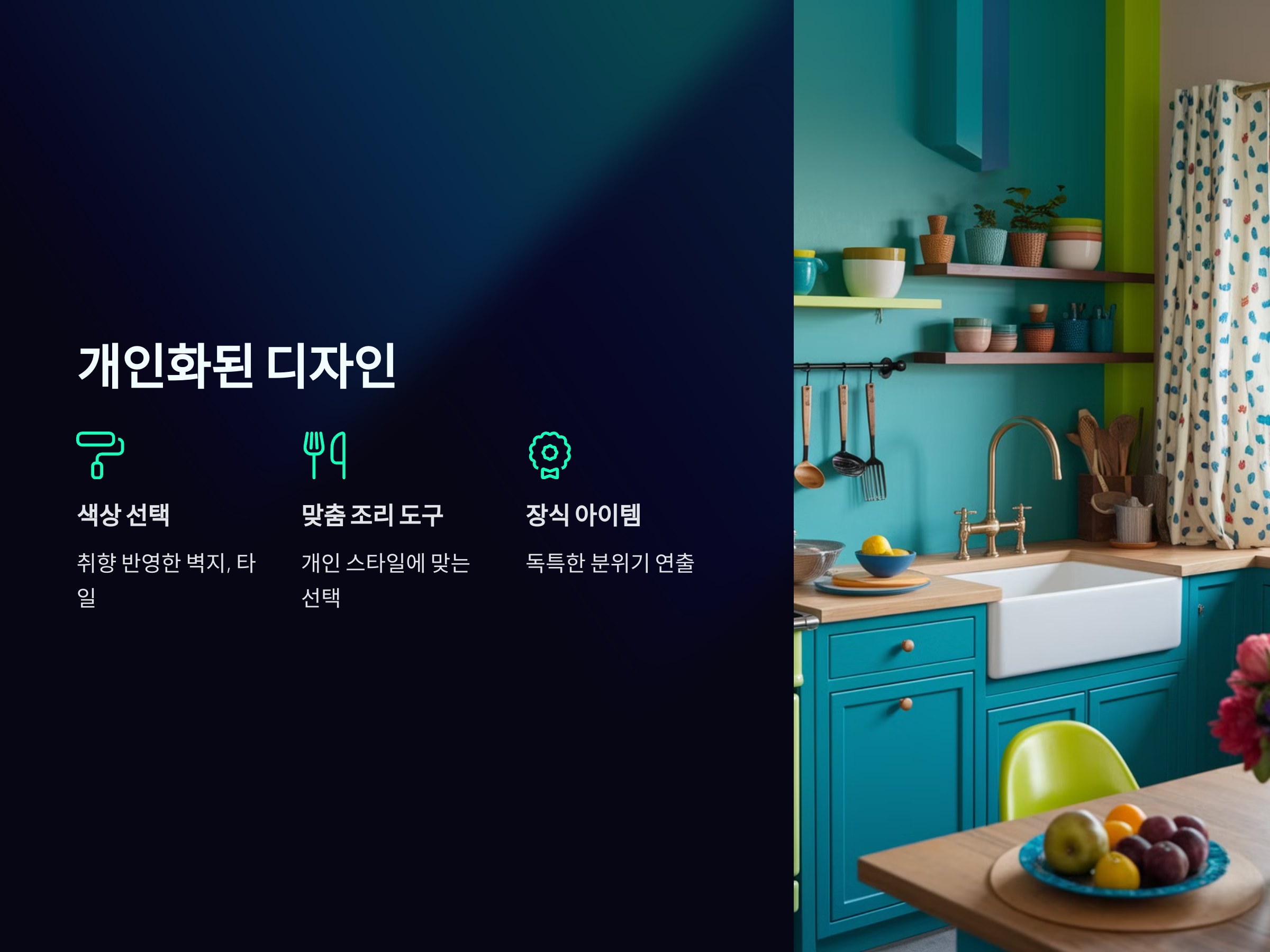 전원주택의 매력은 무엇보다 나만의 공간을 만들 수 있다는 점입니다. 그래서 주방 인테리어에서도 개인의 취향을 반영할 수 있는 요소들을 적절히 넣는 것이 중요합니다. 좋아하는 색상이나 스타일을 적용한 벽지, 커스터마이즈된 조리 도구, 오리지널한 장식 아이템 등을 활용하여 개성 있는 주방을 만들어 보세요. 전원주택의 특성에 맞춰 자연스러운 디자인을 유지하면서도 나만의 개성을 더하는 것이 포인트입니다.