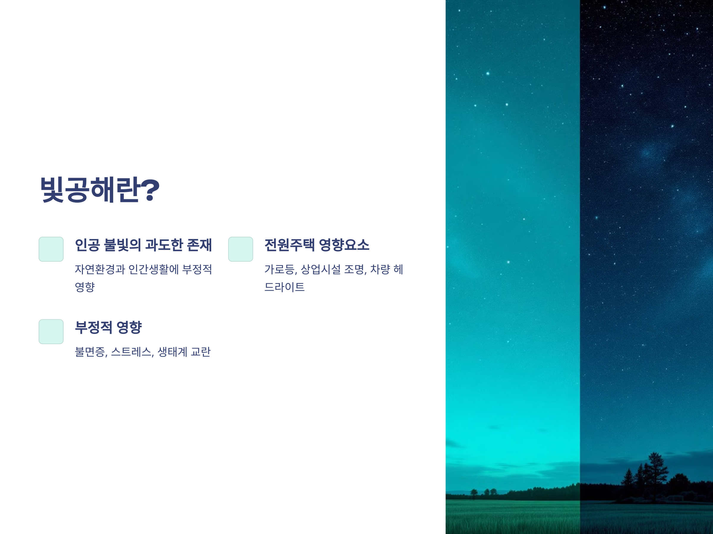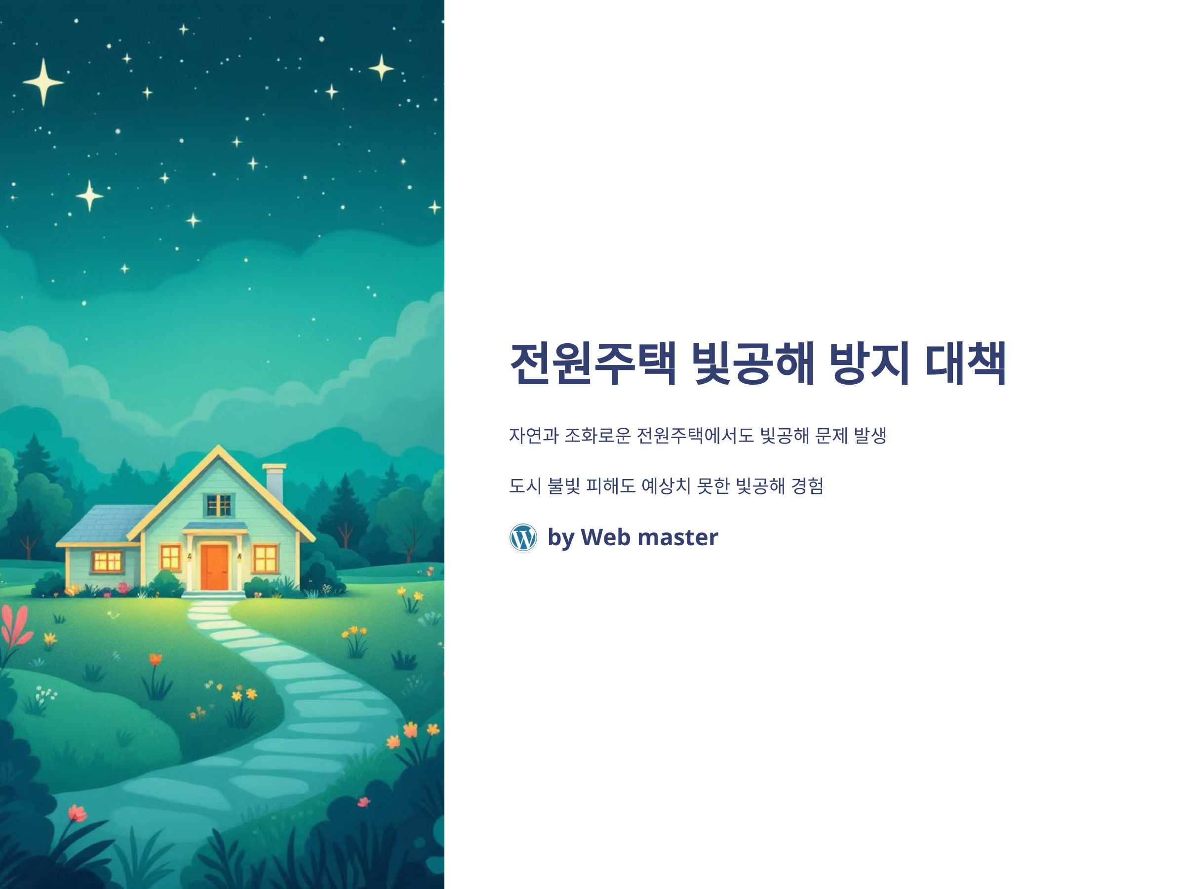 빛공해는 자연적이지 않은 인공적인 불빛이 과도하게 존재하여 자연 환경이나 인간의 생활에 부정적인 영향을 미치는 현상을 말합니다. 주로 도시에서 발생하는 빛공해가 전원주택 지역으로 확대될 때 문제를 일으킬 수 있습니다. 전원주택은 주변 환경이 어두운 특성을 가지고 있기 때문에 외부의 불빛이 자연스럽게 들어오게 되면, 주거지 내 환경이 불편해지고, 심리적으로도 불쾌감을 느낄 수 있습니다.