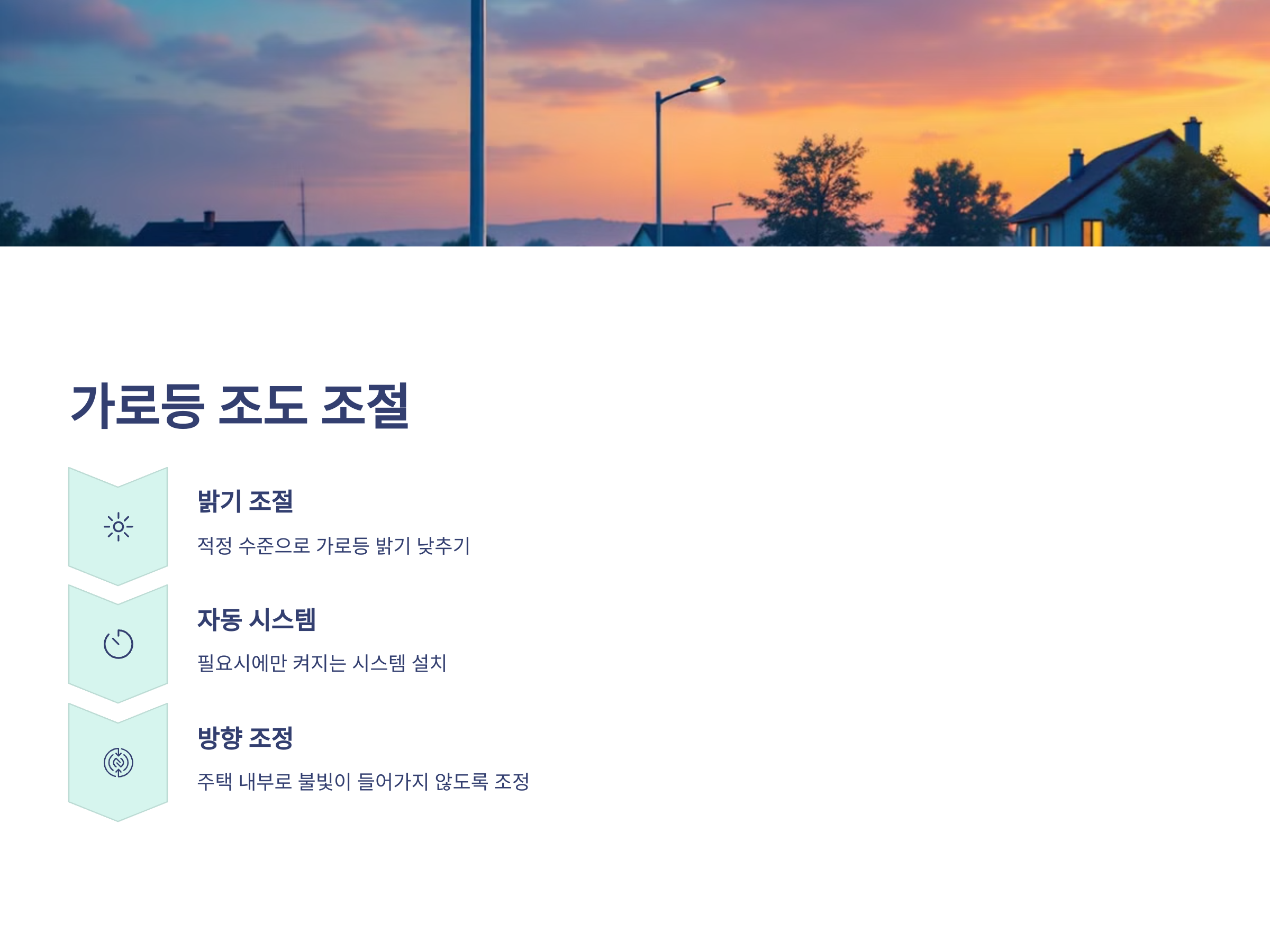 전원주택 지역의 가로등은 너무 밝거나 불필요하게 긴 시간 동안 켜져 있을 수 있습니다. 이러한 가로등의 밝기를 조절하거나, 필요할 때만 켜지는 자동 시스템을 설치하는 것이 중요합니다. 또한 가로등의 방향을 조정하여 불빛이 주택 내부로 들어가지 않도록 유도하는 방법도 효과적입니다.