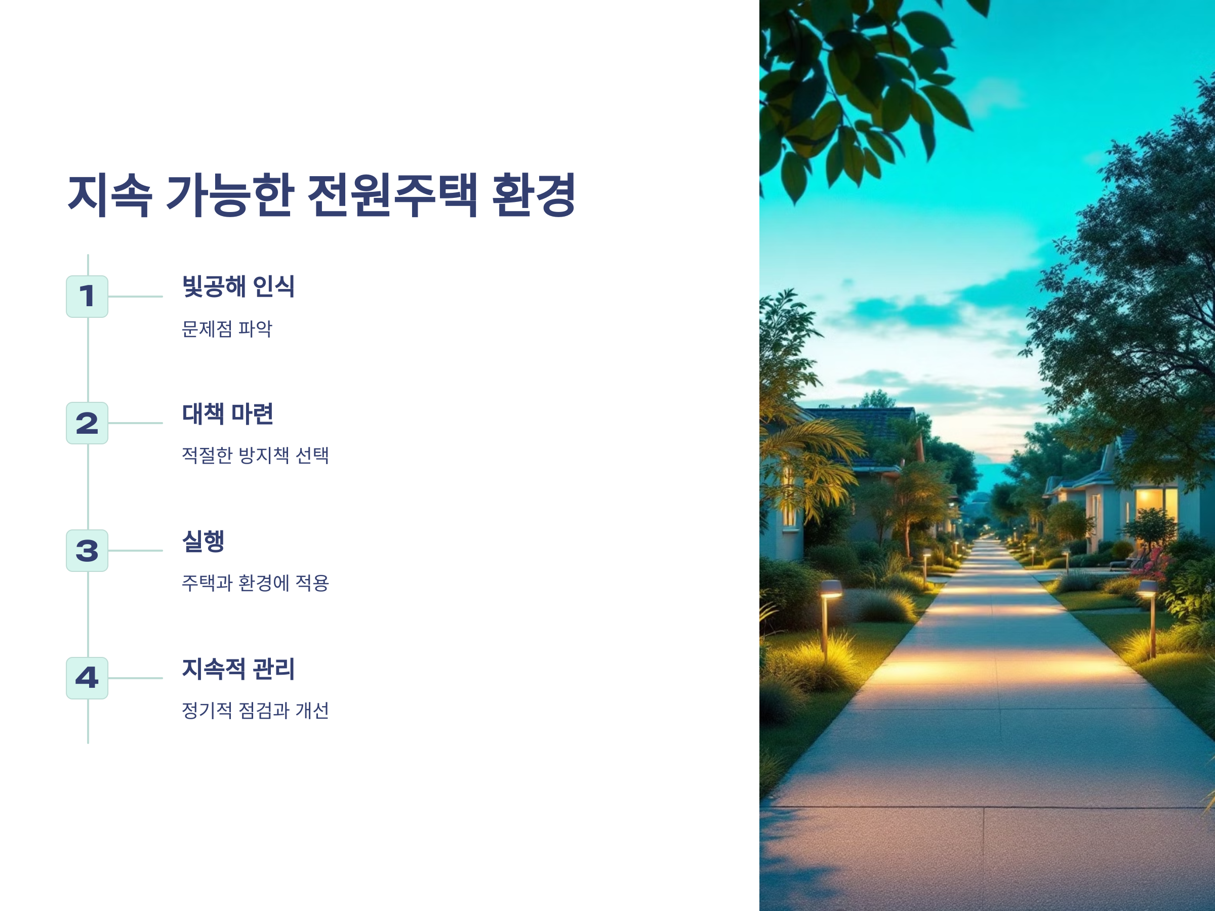 전원주택에서의 빛공해 방지는 그 자체로 환경을 보호하고, 주민들의 삶의 질을 향상시키는 중요한 요소입니다. 빛공해를 방지하기 위한 다양한 대책과 방법들은 주택 설계와 주변 환경 관리에 따라 쉽게 실현될 수 있습니다. 따라서 전원주택 지역에서 빛공해를 방지하기 위한 노력은 매우 중요하며, 지속 가능한 자연 환경을 보존하는 데 기여할 것입니다.