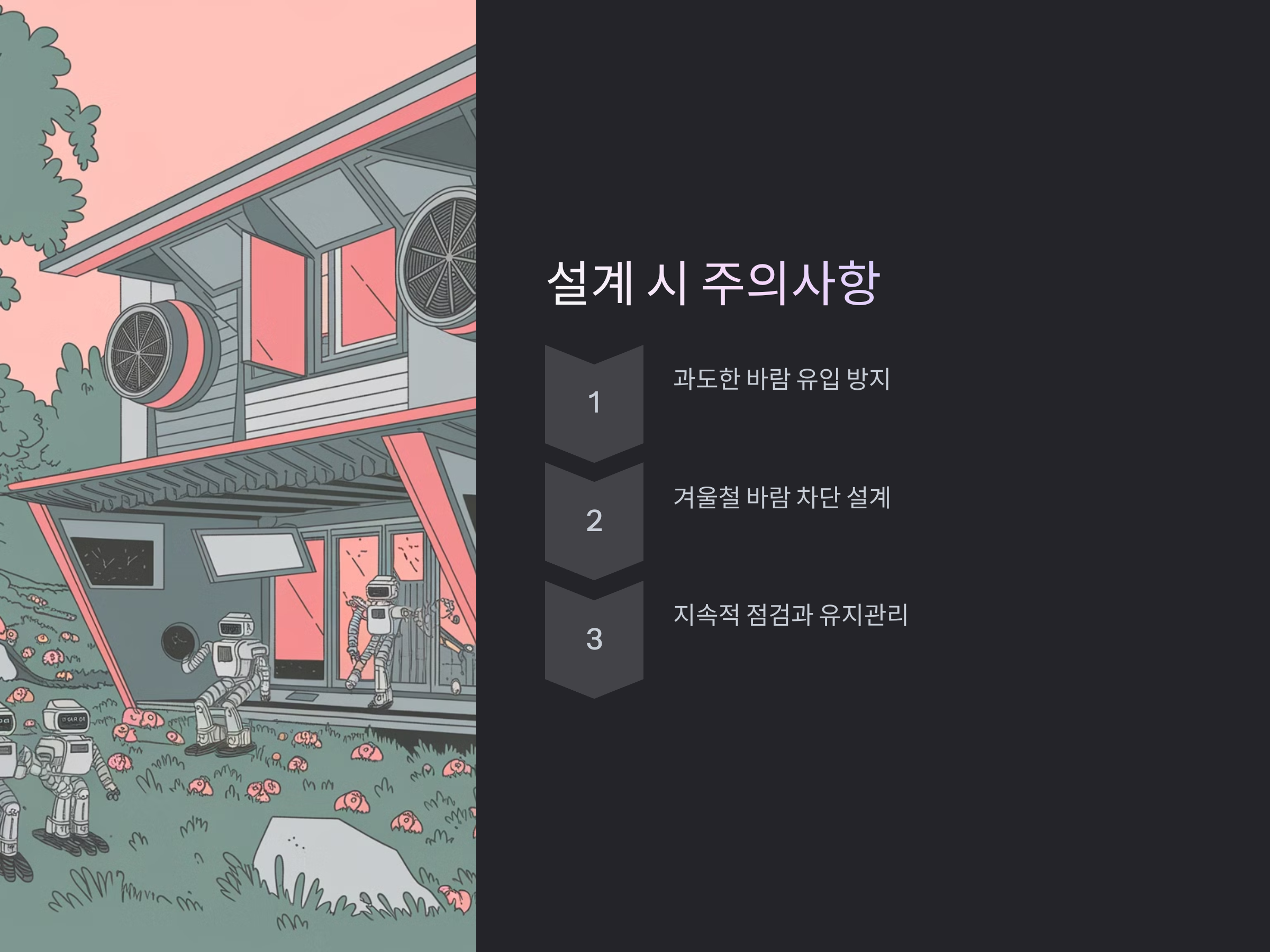 이 설계 과정에서 가장 중요한 점은 바람이 자연스럽게 흐를 수 있는 구조를 만드는 것입니다. 이를 위해 주택의 창문 위치, 문, 천창, 그리고 통풍구의 배치가 중요한 요소로 작용합니다.