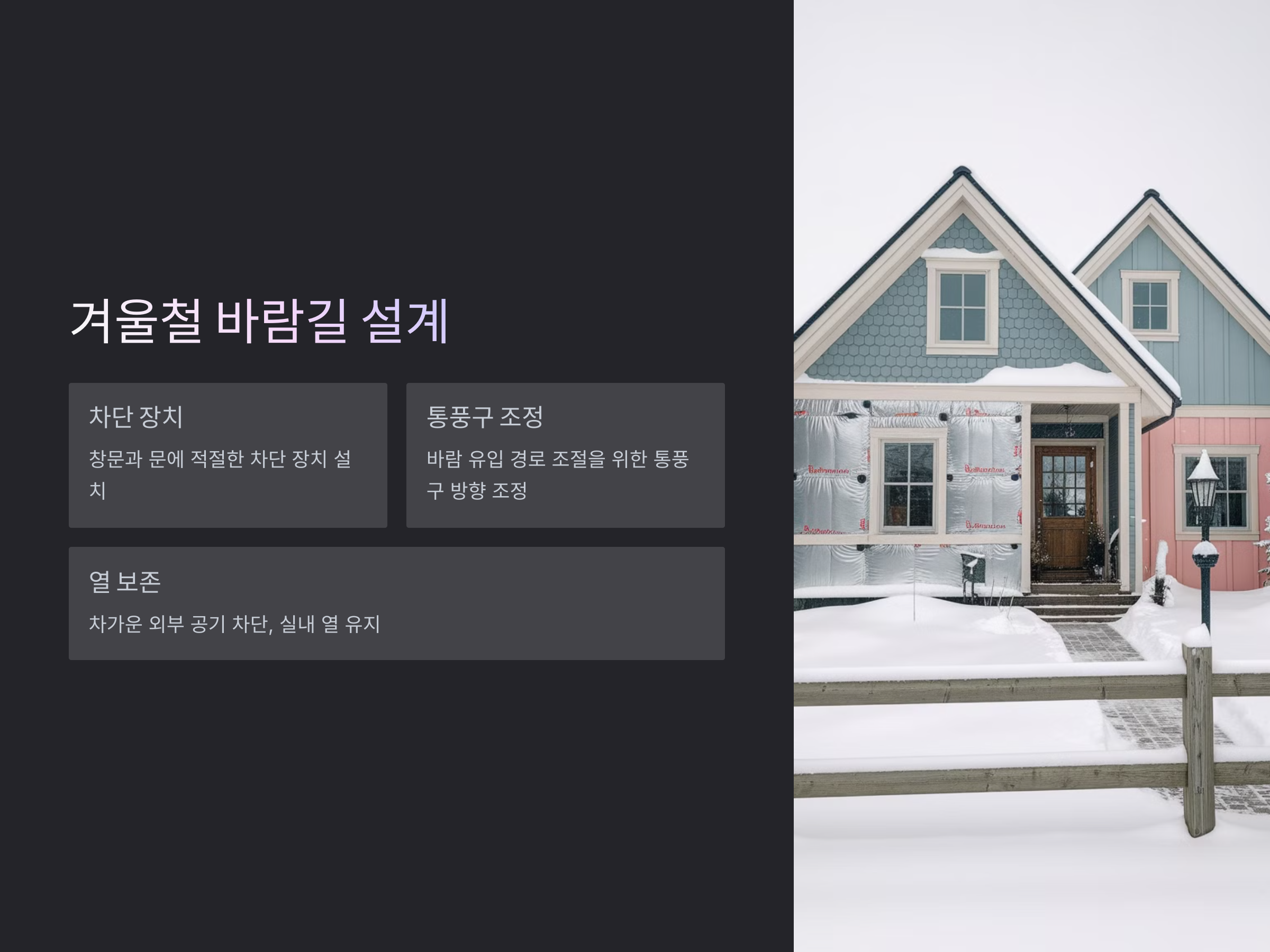 겨울에는 차가운 바람이 실내로 들어오지 않도록 설계해야 합니다. 창문과 문에 적절한 차단 장치를 두거나, 통풍구의 방향을 조정하여 바람이 들어오는 경로를 막을 수 있습니다.