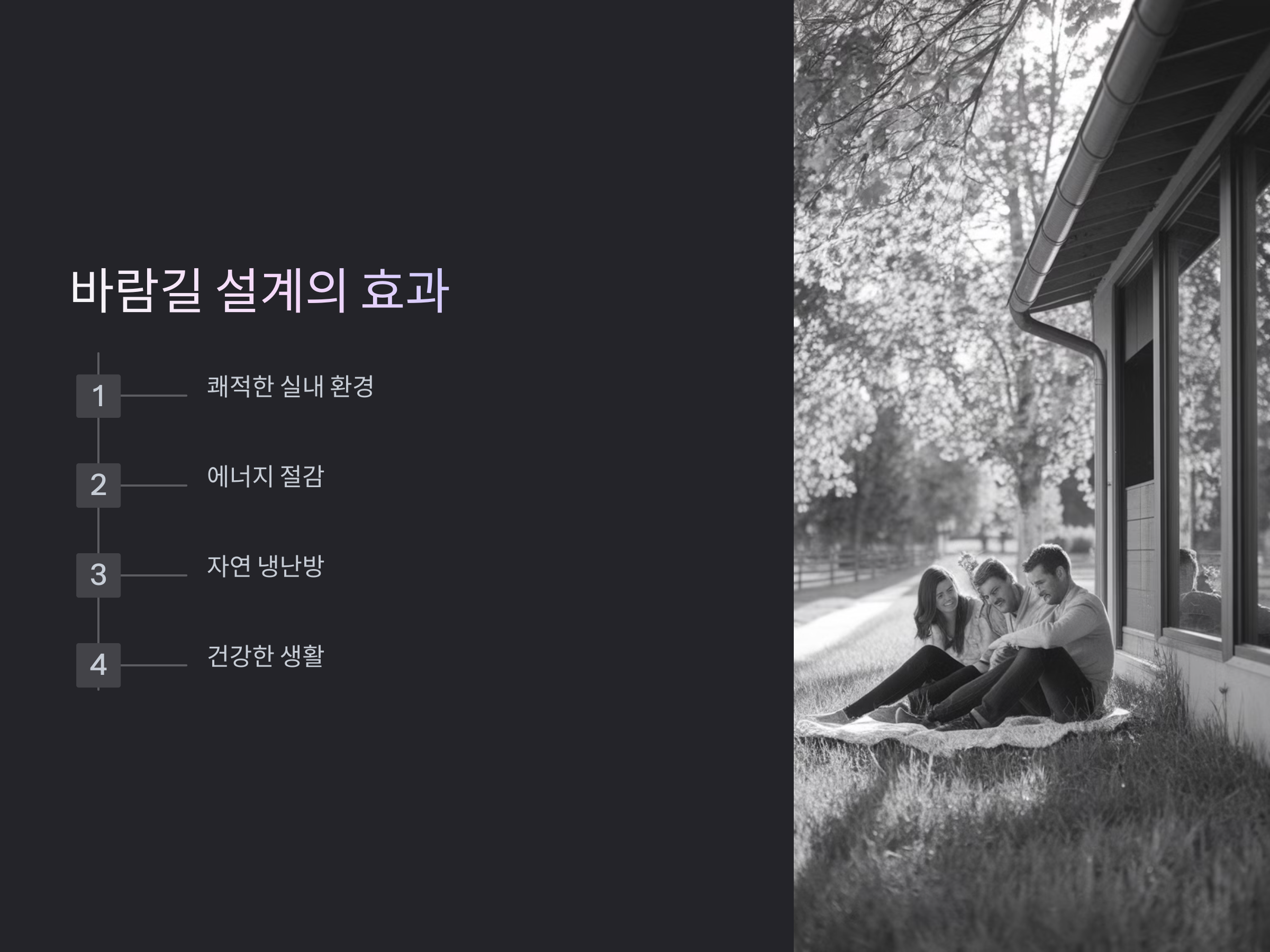 바람길 설계를 통해 자연 통풍을 유도하면, 에어컨이나 히터를 자주 사용하지 않아도 됩니다. 자연적인 바람이 실내 공기를 순환시키고, 여름에는 더위를 식히고 겨울에는 실내 온도를 유지해 에너지 비용을 절감할 수 있습니다.