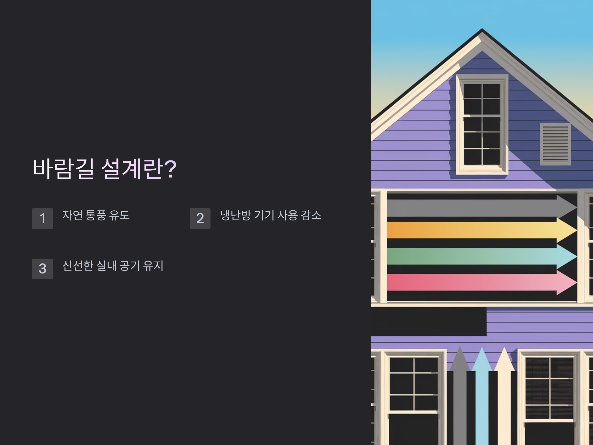 바람길 설계는 말 그대로 바람이 집 안으로 잘 통과하도록 설계하는 과정입니다. 바람길을 잘 계획하면 자연적인 통풍을 유도해 실내 온도를 유지하고, 에어컨이나 히터와 같은 인공적인 냉난방 기기의 사용을 줄일 수 있습니다. 또한, 바람이 집을 지나갈 수 있도록 하는 것만으로도 실내 공기가 신선하게 유지되고, 건강한 생활 환경을 만들 수 있습니다.