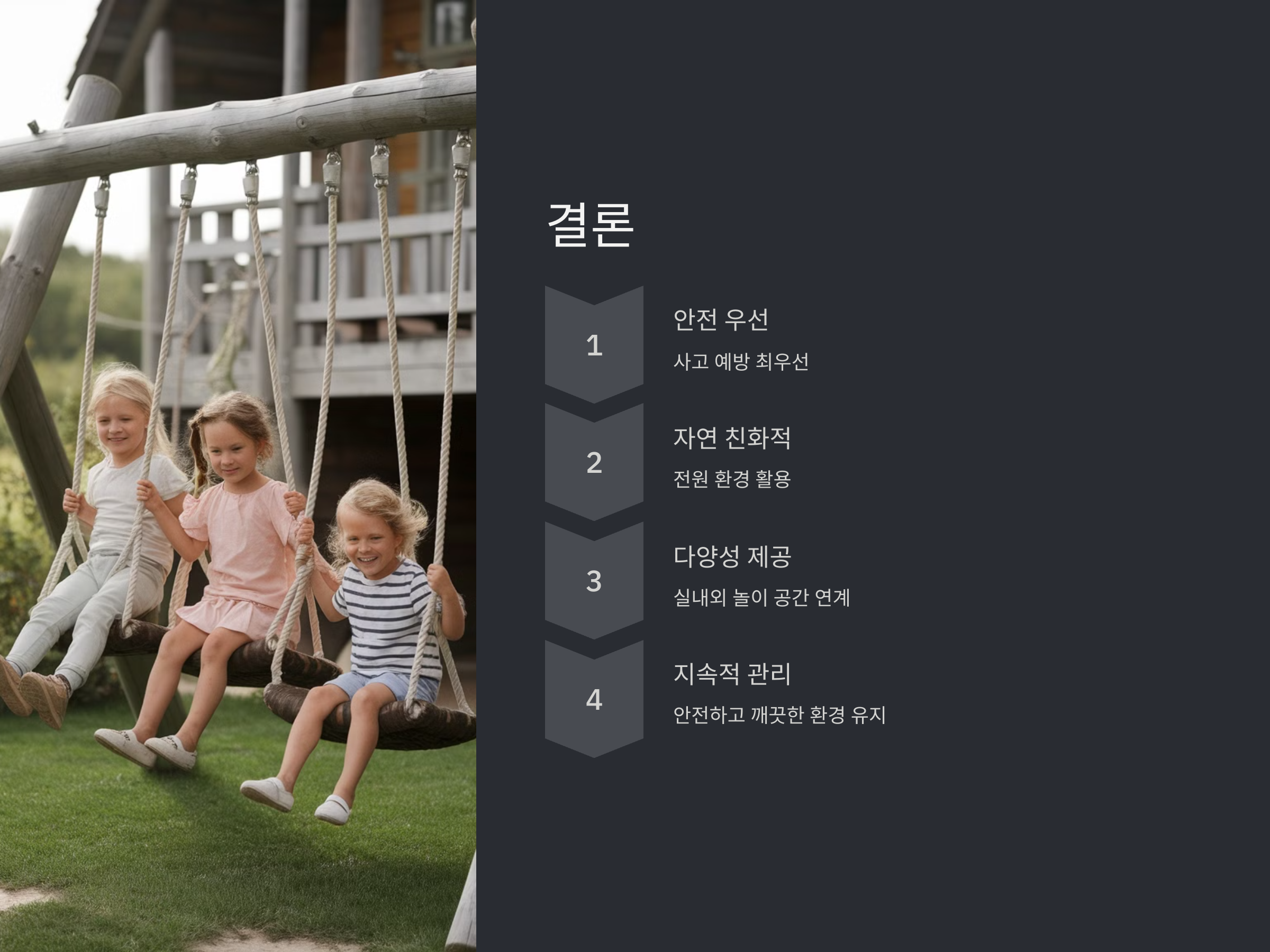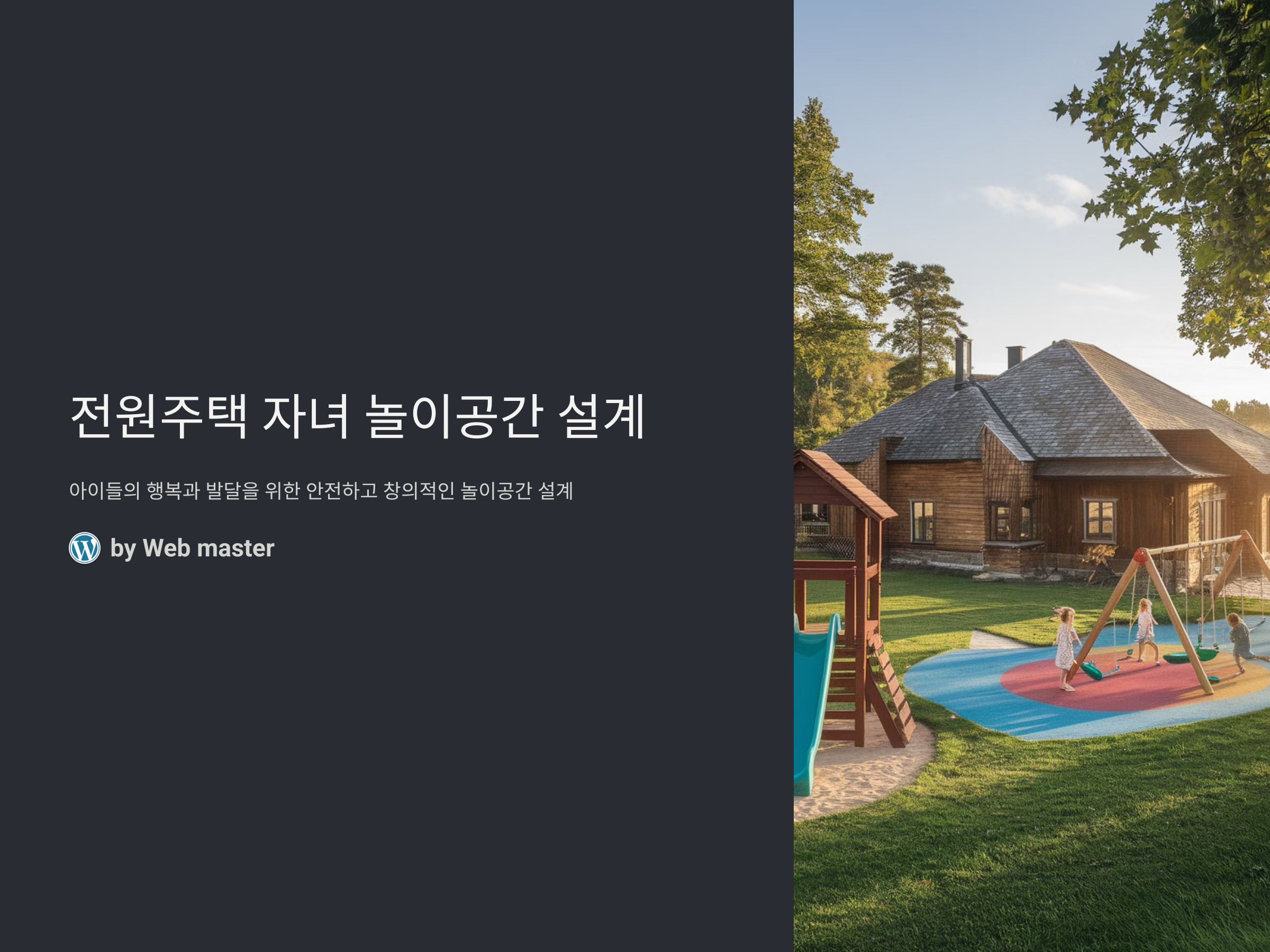 전원주택에서 자녀 놀이공간을 설계하는 것은 아이들의 건강과 행복한 성장을 위한 중요한 작업입니다. 안전하고 창의적인 놀이공간을 제공하여 자녀들이 마음껏 놀 수 있도록 돕고, 자연과의 교감을 통해 더 풍요로운 삶을 누릴 수 있도록 해주세요.
