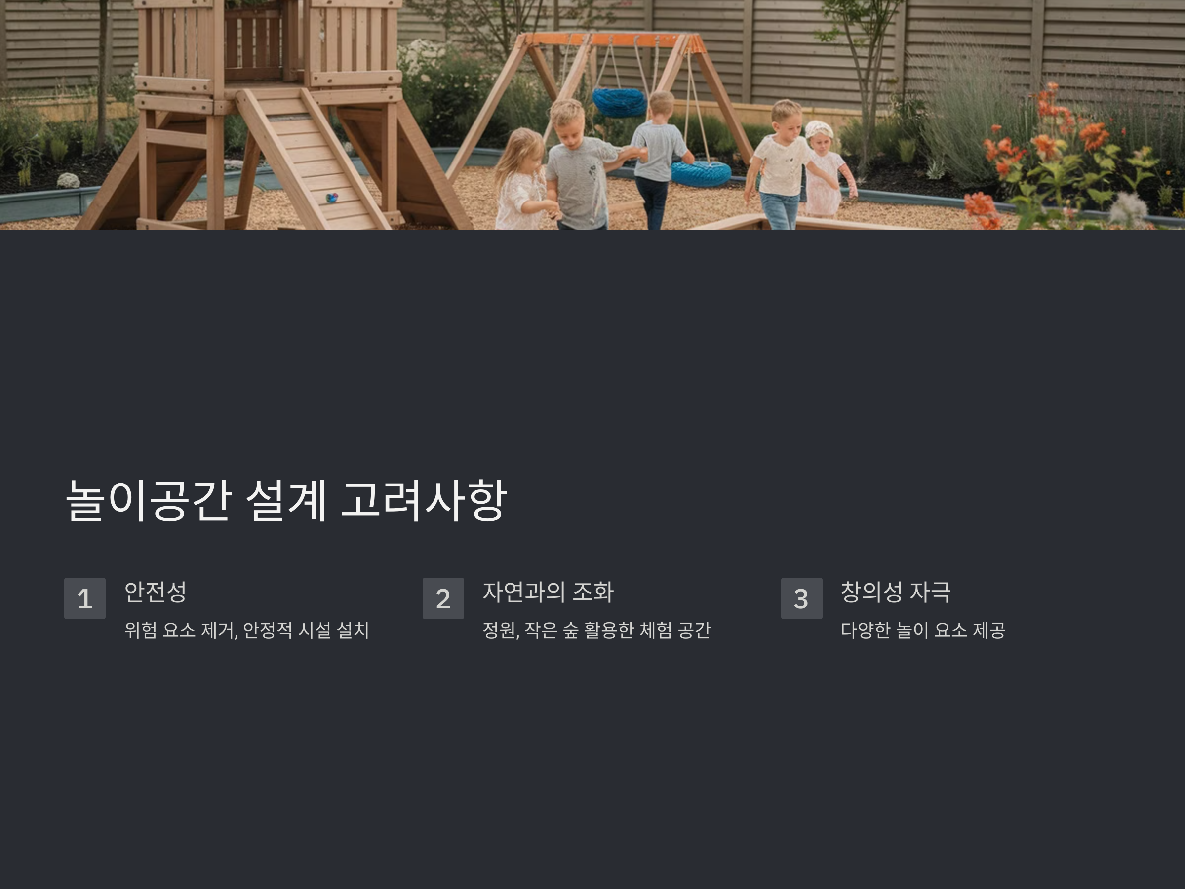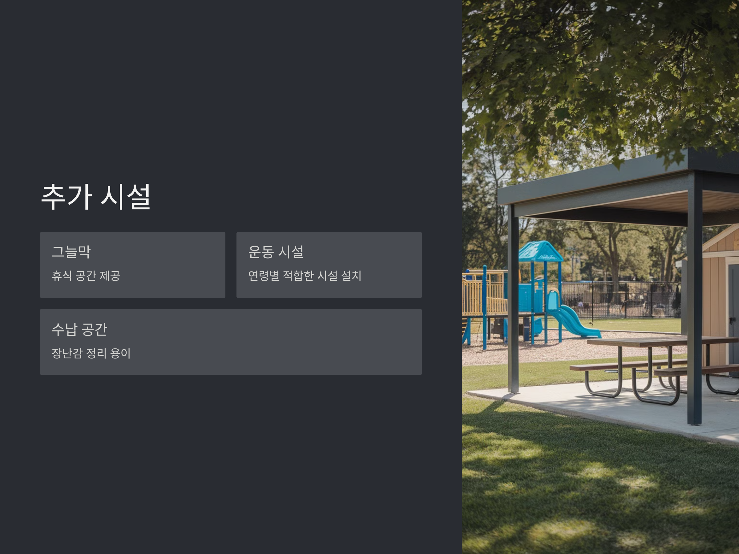 놀이공간에 그늘막, 휴식 공간, 벤치 등을 추가하여 아이들이 휴식을 취할 수 있는 공간을 마련하는 것이 좋습니다. 또한, 나이에 맞는 운동시설을 설치해 아이들이 다양한 활동을 할 수 있도록 합니다.