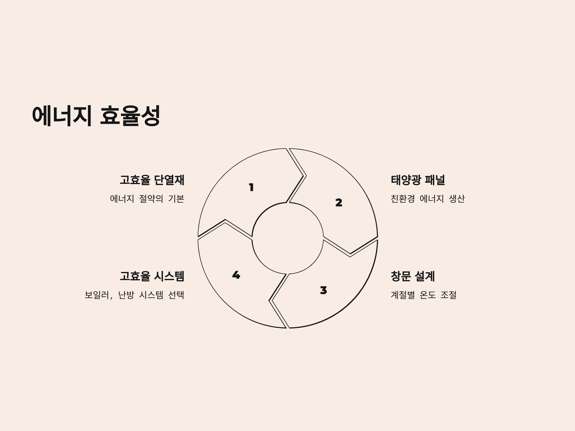 전원주택의 설계에서 중요한 또 하나의 요소는 에너지 효율성입니다. 소형 주택일수록 에너지 절약이 가능하지만, 설계에서 신경 써야 할 부분들이 많습니다. 고효율 단열재를 사용하거나, 태양광 패널을 설치하는 방법도 고려해볼 수 있습니다. 또한, 창문 크기를 적절히 설계하여 여름철에는 차가운 공기가 들어오고 겨울철에는 따뜻한 공기가 빠져나가지 않도록 해야 합니다.