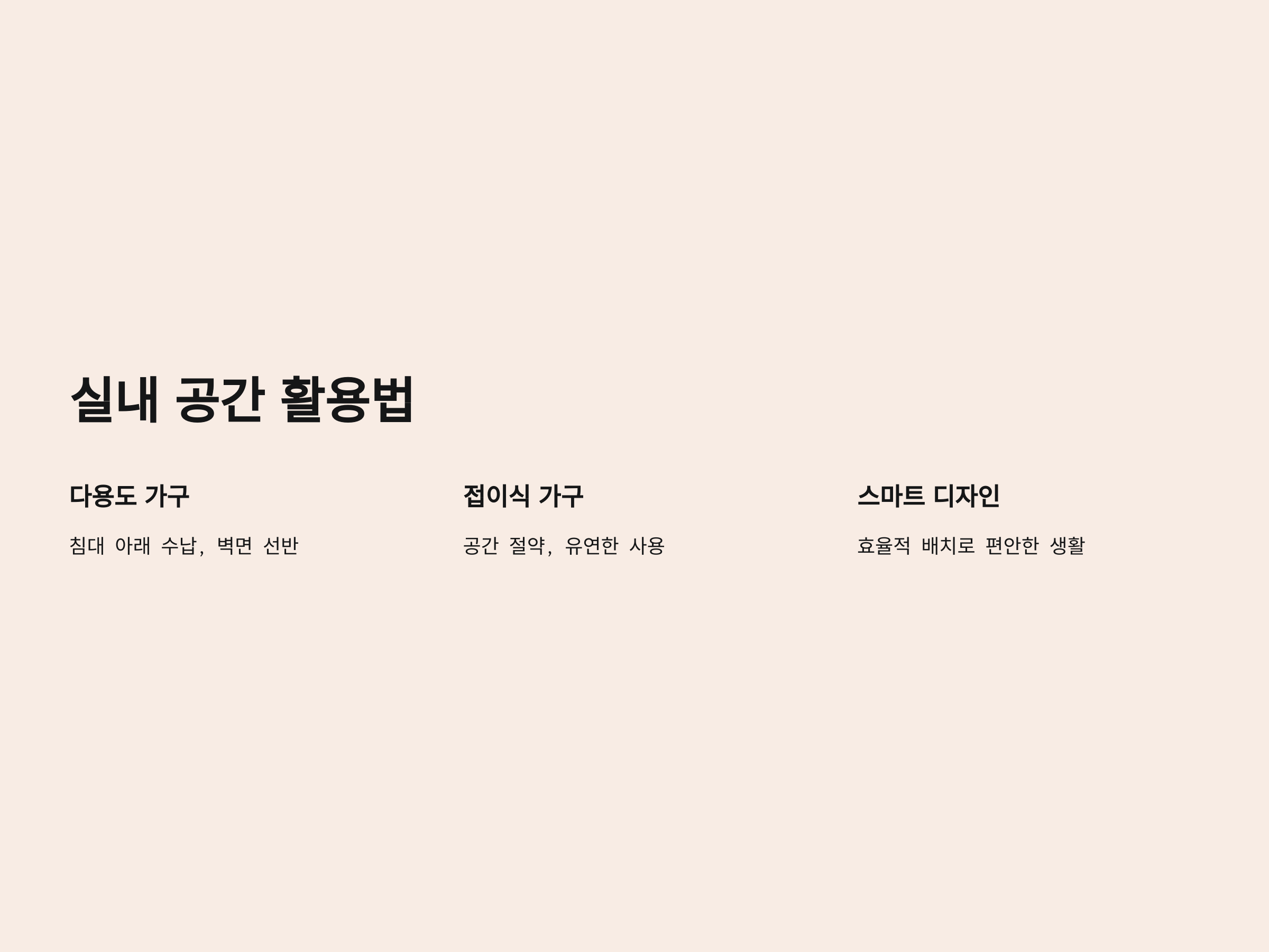 공간이 적다고 해서 불편해야 하는 것은 아닙니다. 스마트한 디자인과 효율적인 가구 배치로 작은 공간에서도 편안하게 지낼 수 있습니다. 예를 들어, 접이식 테이블이나 다기능 소파 등을 사용하여, 공간을 자유롭게 활용할 수 있는 방법들을 생각해보세요.