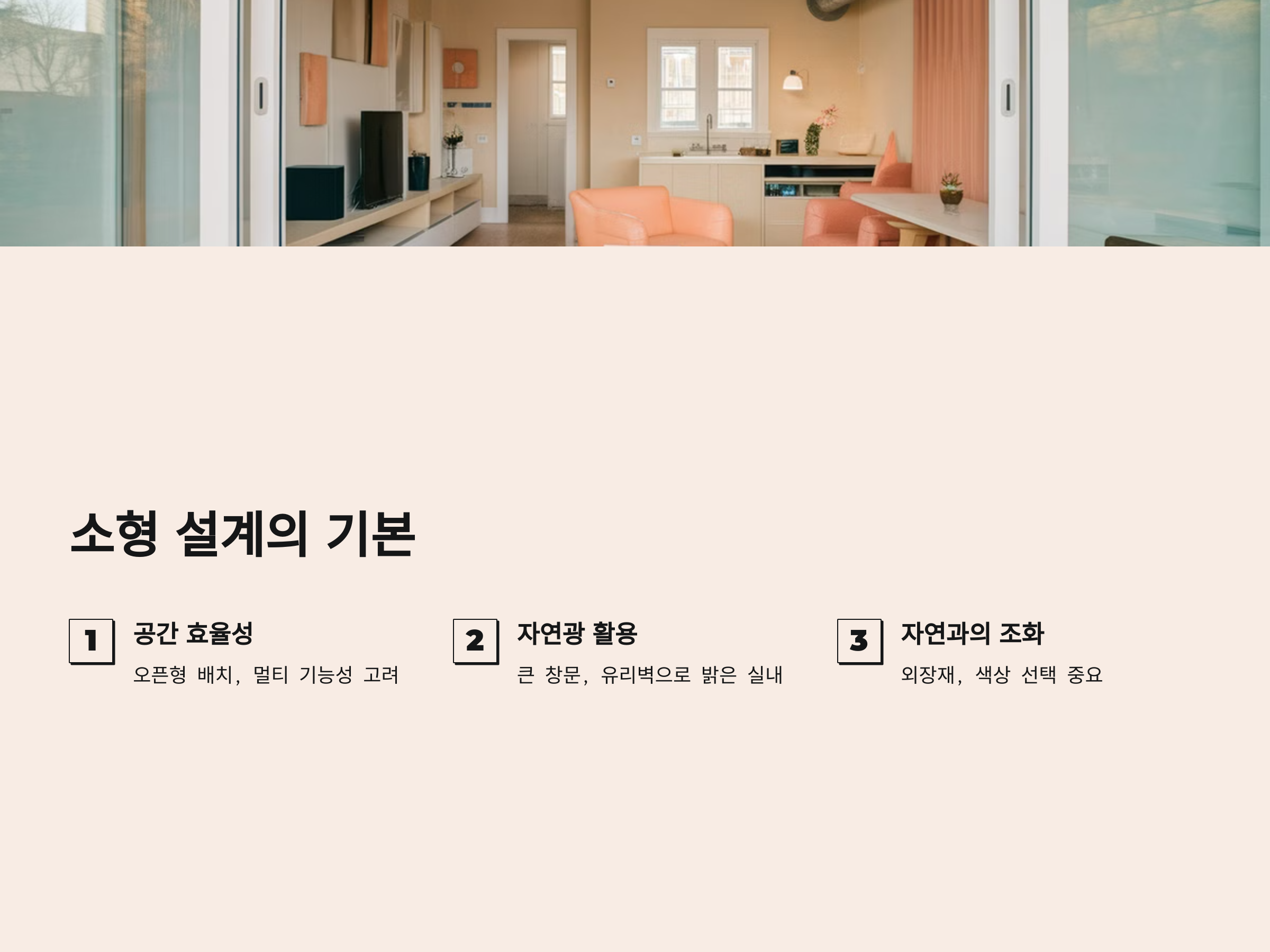 - 거실: 공간을 넓게 사용하기 위해 거실은 오픈형으로 설계하는 것이 좋습니다. 소형 주택에서는 거실이 가장 중요한 공간으로, 생활의 중심이 되기 때문입니다.
