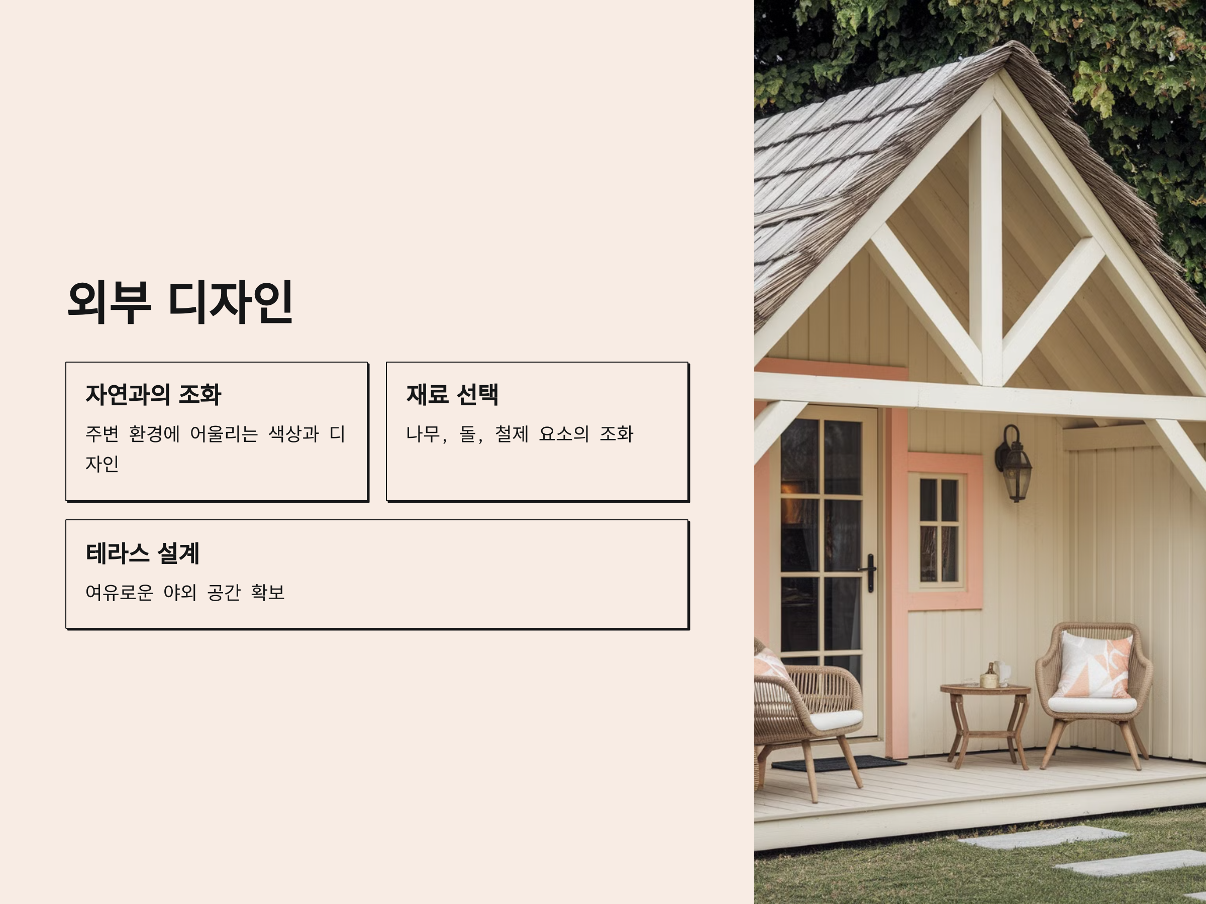 외부 디자인에서는 테라스를 설계하는 것도 좋은 아이디어입니다. 작은 테라스나 야외 공간을 만들면, 여유로운 시간을 보낼 수 있는 공간을 확보할 수 있습니다. 테라스에 앉아 자연을 즐기며 커피 한 잔을 마시는 것만으로도 전원생활의 매력을 만끽할 수 있습니다.