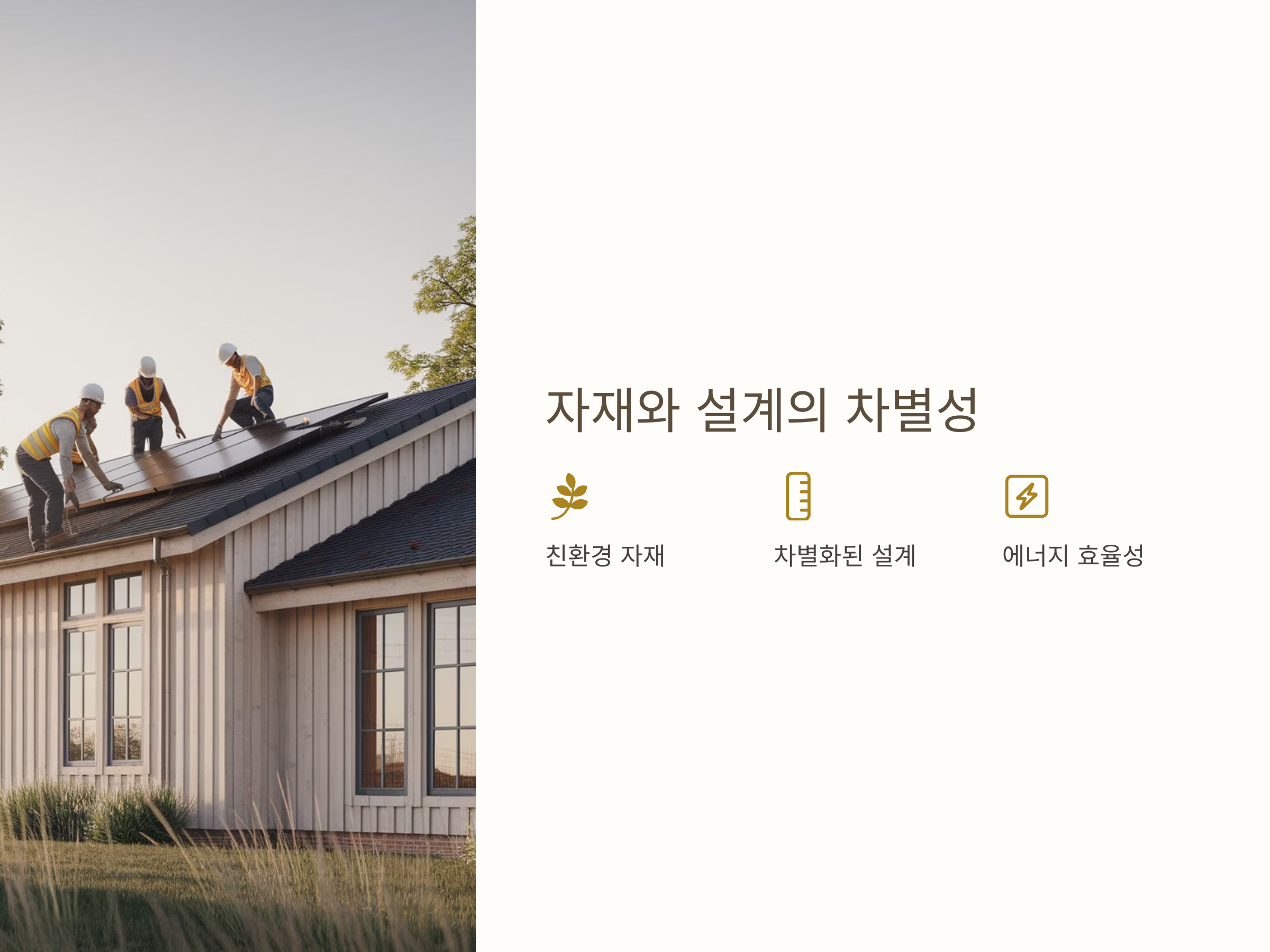 전원주택의 핵심은 바로 자재와 설계입니다. 전원주택은 자연과의 조화를 고려한 설계와 함께, 지속 가능한 자재를 사용하는 것이 중요합니다. 시공업체가 어떤 자재를 사용하는지, 그리고 얼마나 친환경적인 설계를 제공하는지에 대한 정보를 체크하는 것이 필요합니다.