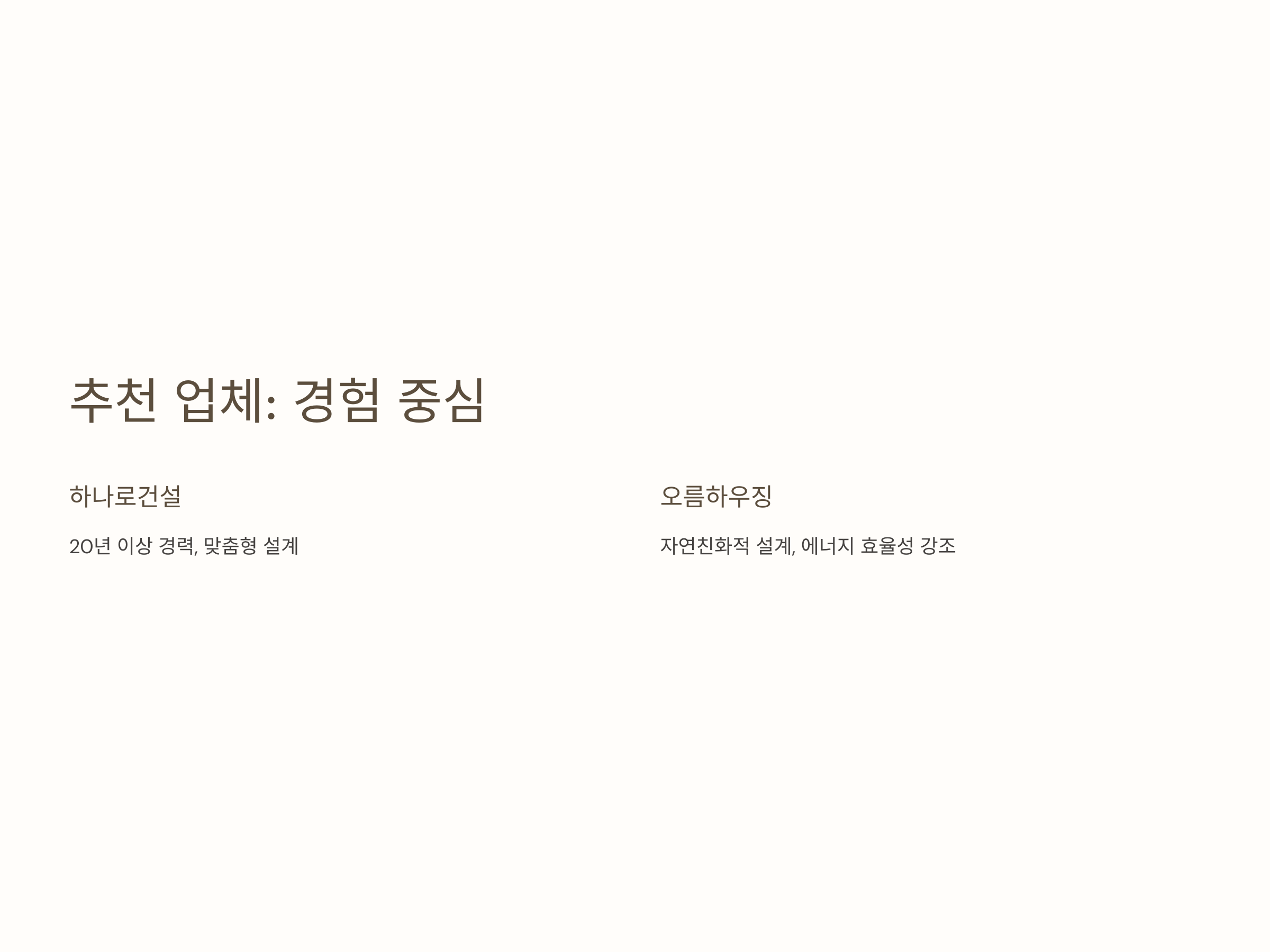 오름하우징은 자연친화적인 전원주택 설계 및 시공을 전문으로 하는 업체로, 환경을 고려한 자재 선택과 에너지 효율성을 강조하는 점이 특징입니다. 오랜 경력과 다양한 프로젝트 경험을 바탕으로 신뢰도가 높습니다.