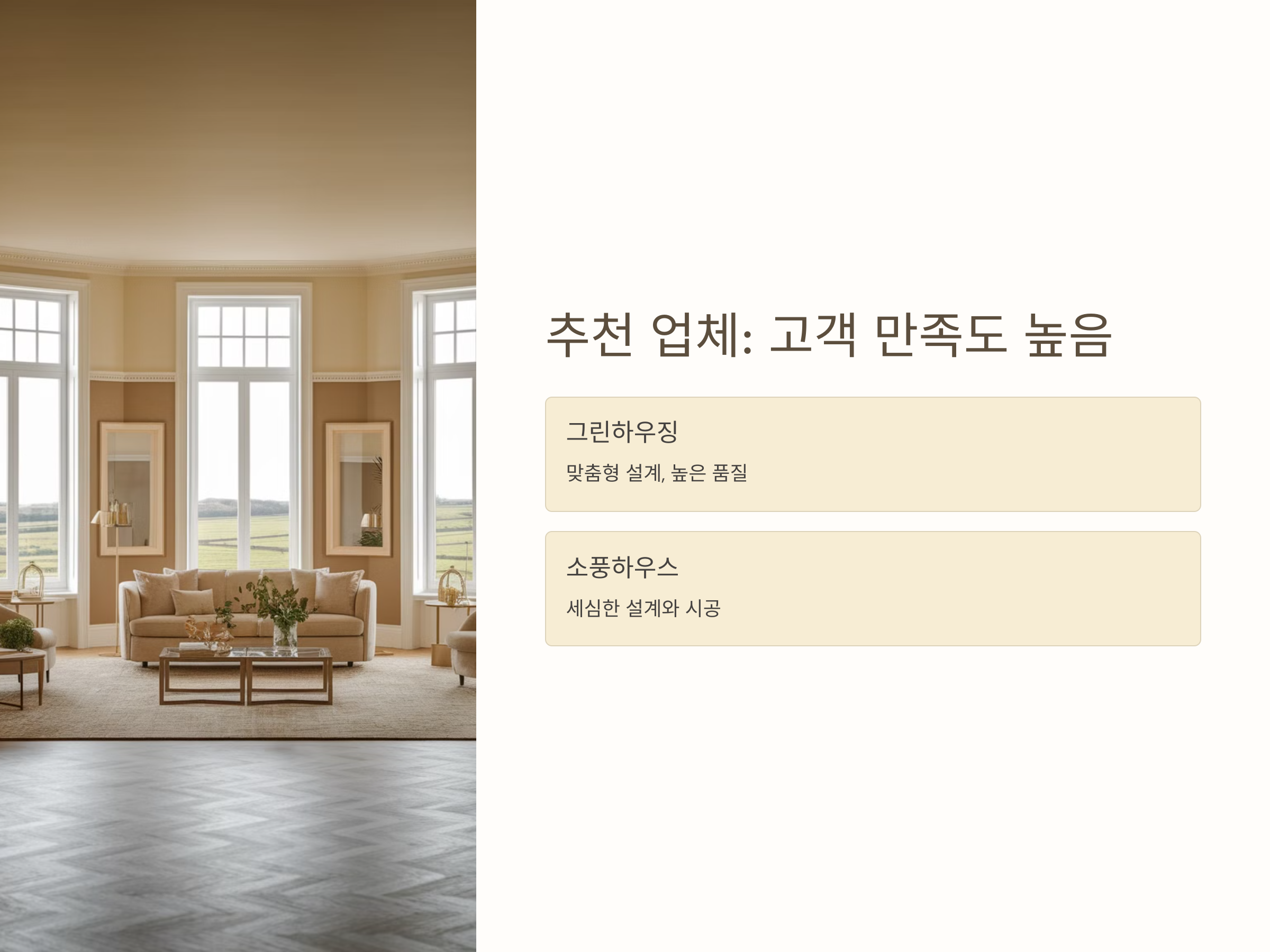 그린하우징은 고객 만족도가 매우 높은 업체로, 후기에서도 '예상보다 더 만족스러운 결과'라는 평을 자주 얻고 있습니다. 특히, 고객의 요구에 맞춘 맞춤형 설계와 탁월한 품질로 인기를 끌고 있습니다.
