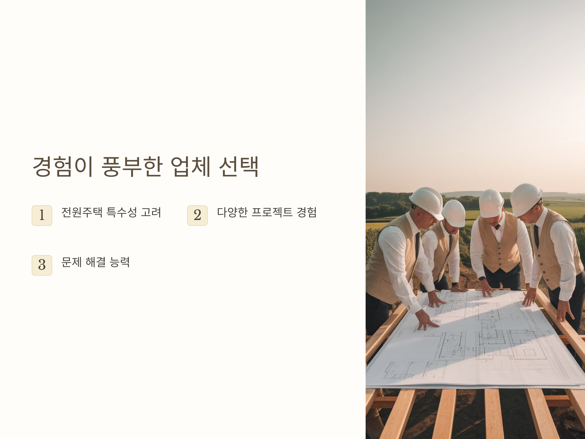 전원주택을 짓는 데 있어 가장 중요한 점은 바로 '경험'입니다. 일반적인 아파트나 주택 시공과는 달리, 전원주택은 자연 환경과의 조화, 특수한 건축 구조, 그리고 지속 가능한 자재 사용 등을 고려해야 합니다. 이를 잘 처리할 수 있는 경험 많은 업체를 선택하는 것이 가장 중요한 포인트입니다.