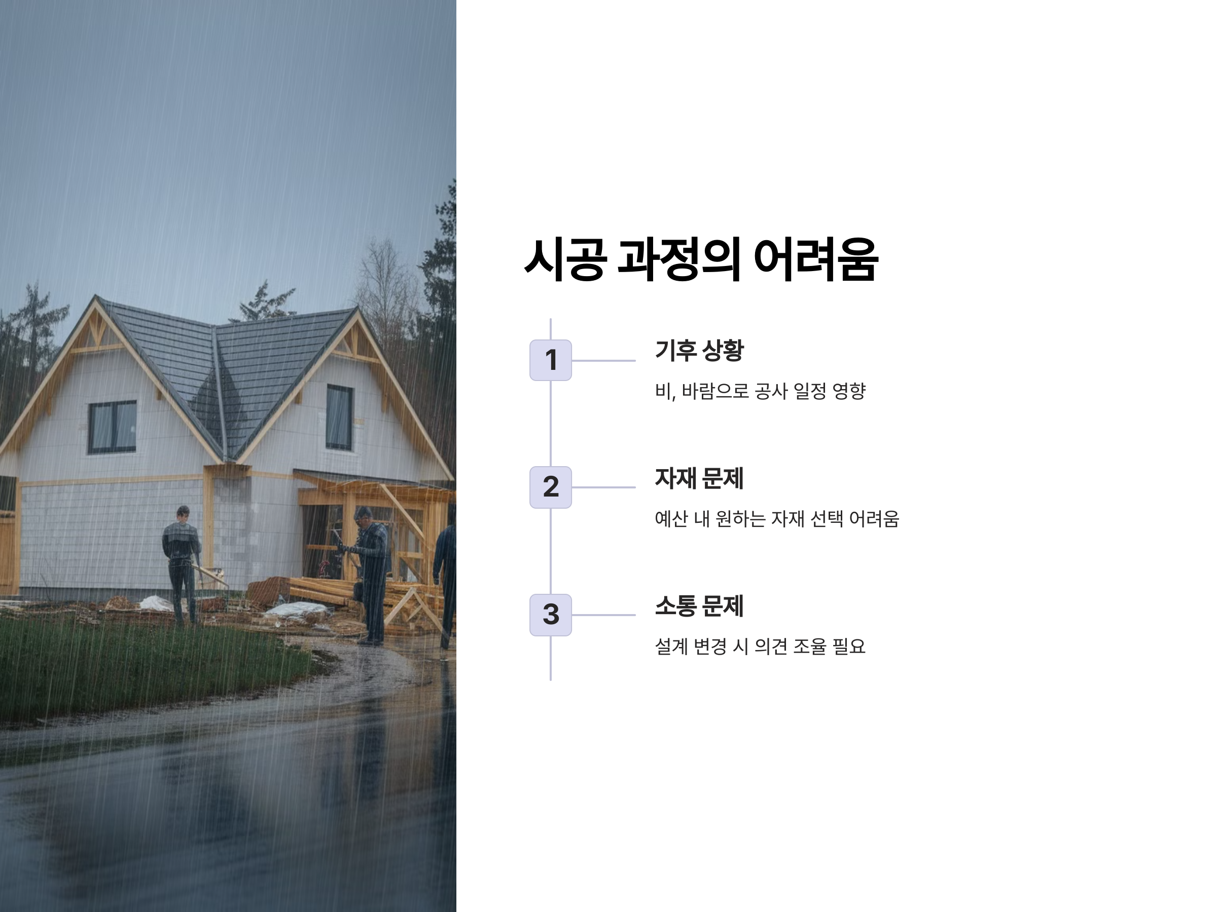 시공이 시작되면 생각보다 많은 변수들이 생깁니다. 첫 번째로, 예기치 못한 기후 상황이 있었습니다. 비가 자주 내리거나 바람이 세게 불어 공사 일정에 영향을 미쳤습니다. 그리고 자재 문제도 발생했습니다. 예산 내에서 원하는 자재를 선택하기가 어려워 몇 번의 변경을 거쳤습니다.