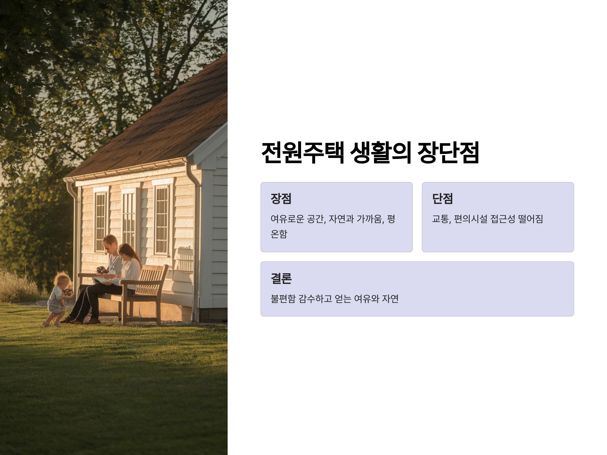 전원주택에서 실제로 살아보니, 많은 기대감을 안고 시작했지만 그만큼 많은 일들이 따랐습니다. 우선, 생활의 질이 확실히 향상되었습니다. 여유로운 공간, 자연을 가까이에서 느낄 수 있는 환경, 그리고 무엇보다도 자신만의 공간에서 느낄 수 있는 평온함은 도시에서는 느낄 수 없는 특별한 경험입니다.