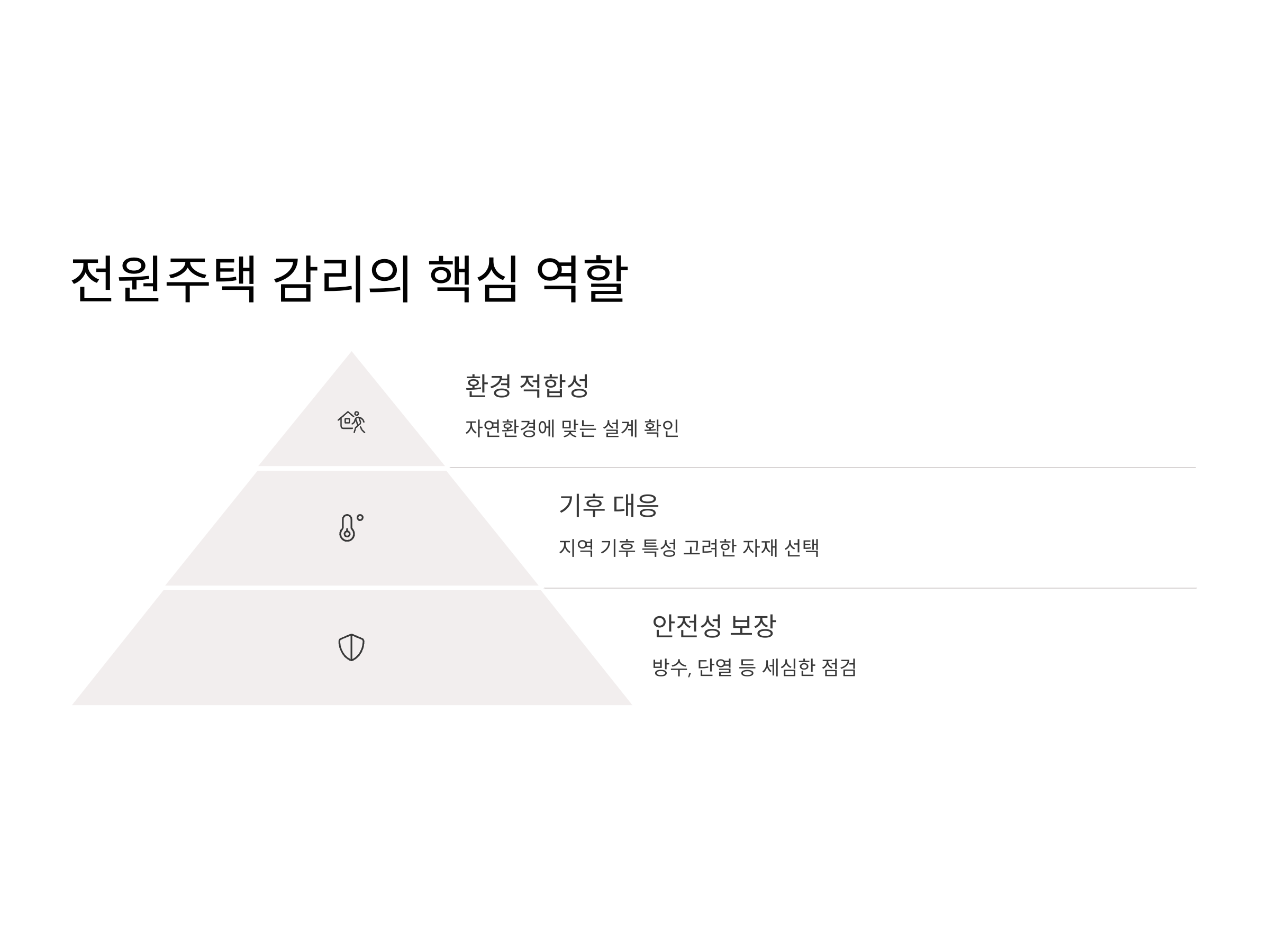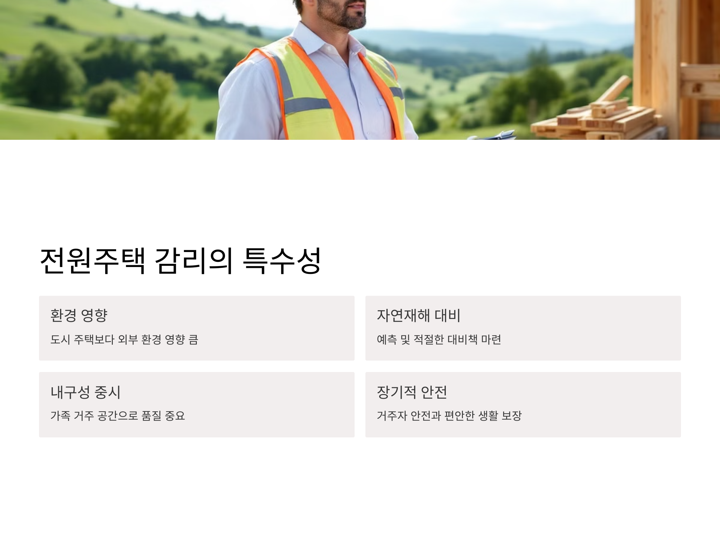 전원주택 신축 시, 감리가 중요한 이유는 그만큼 환경과 건축물의 특수성이 반영되기 때문입니다. 예를 들어, 전원주택의 경우 도시 지역의 주택과 비교해 외부 환경의 영향을 크게 받을 수 있습니다. 자연재해나 외부 환경에 따라, 건축물의 안정성에 영향을 미칠 수 있습니다. 감리자는 이러한 문제를 사전에 예측하고, 적절한 대비책을 마련하는 역할을 합니다.