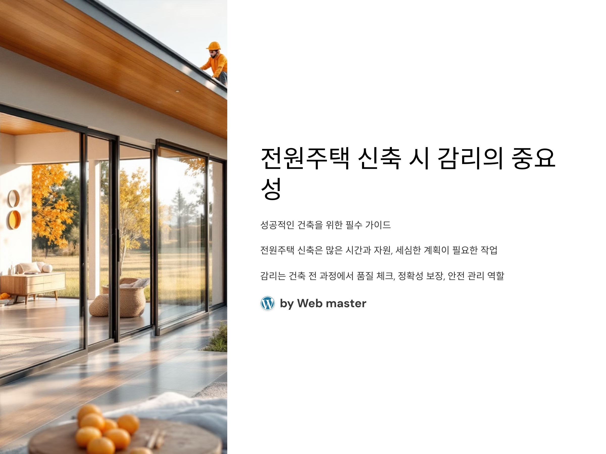 전원주택을 신축할 때 감리는 그 무엇보다 중요한 요소입니다. 안전성, 품질, 공정 관리 등 여러 측면에서 감리는 성공적인 건축을 위한 필수 과정입니다. 감리자는 건축물의 내구성을 높이고, 외부 환경에 맞는 건축을 실현할 수 있도록 돕습니다. 전원주택을 신축하는 과정에서 감리를 제대로 진행하는 것이, 향후 문제가 발생하지 않고 안전하고 편안한 주거 환경을 제공할 수 있는 핵심입니다.