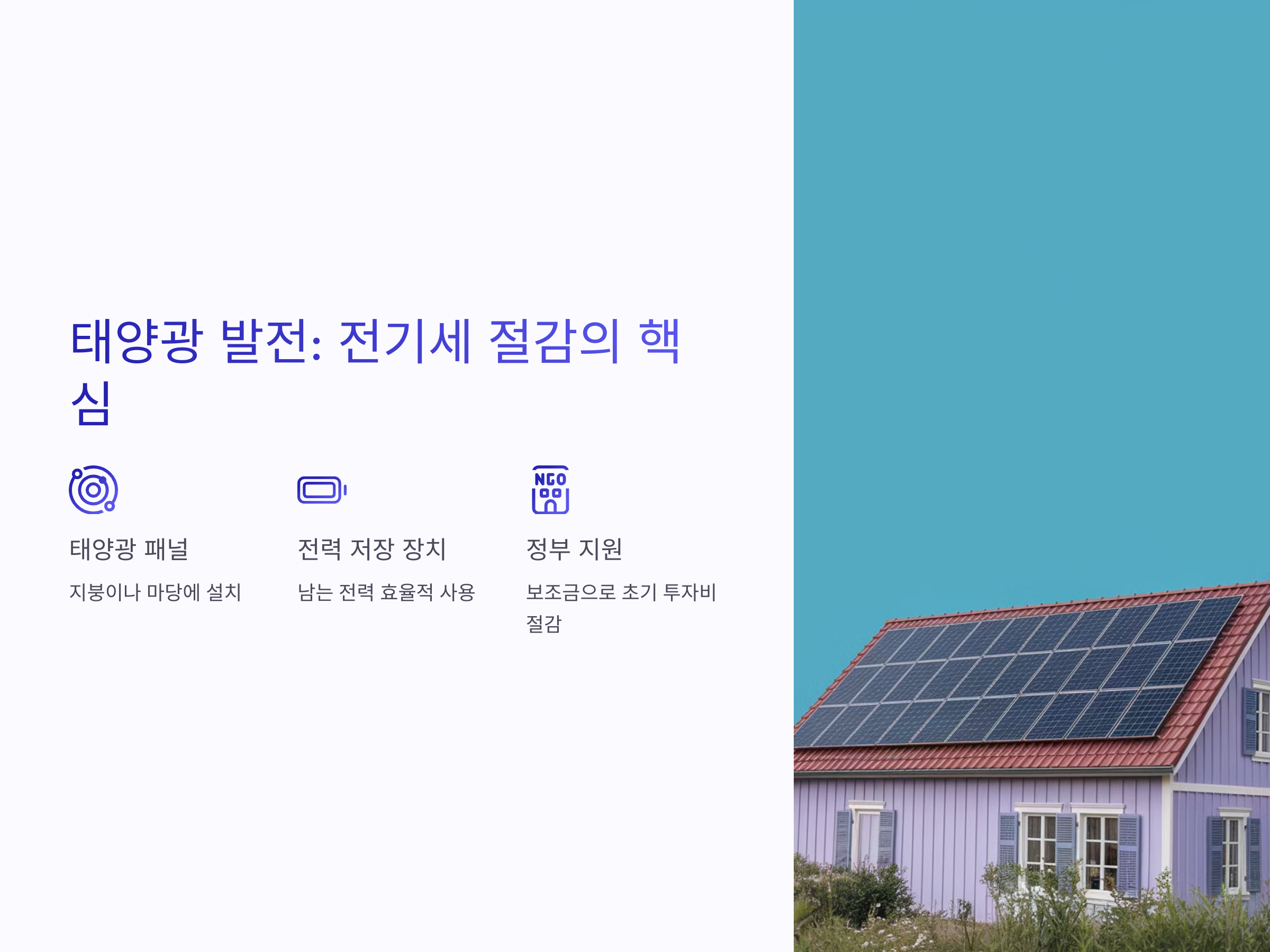 - 태양광 패널 설치: 지붕이나 마당에 태양광 패널을 설치하면 자체적으로 전기를 생산할 수 있습니다.