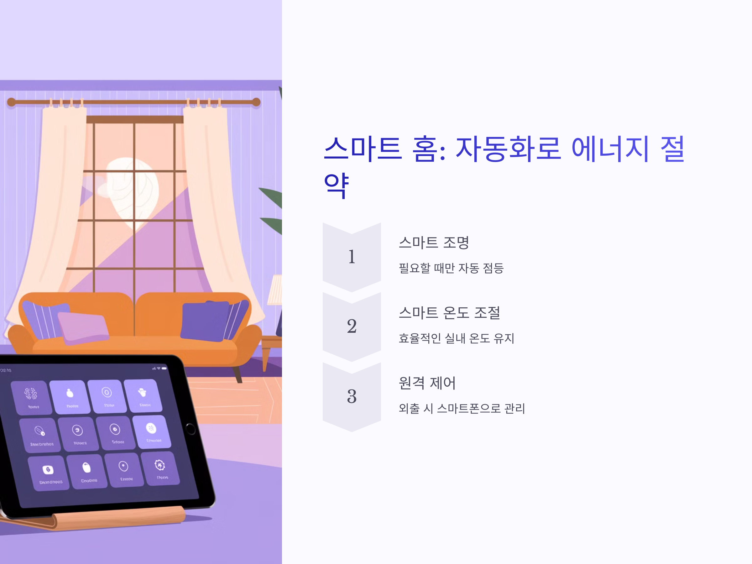 - 스마트 조명 제어: 스마트 전구와 센서를 활용해 필요할 때만 조명을 켜도록 설정할 수 있습니다.
