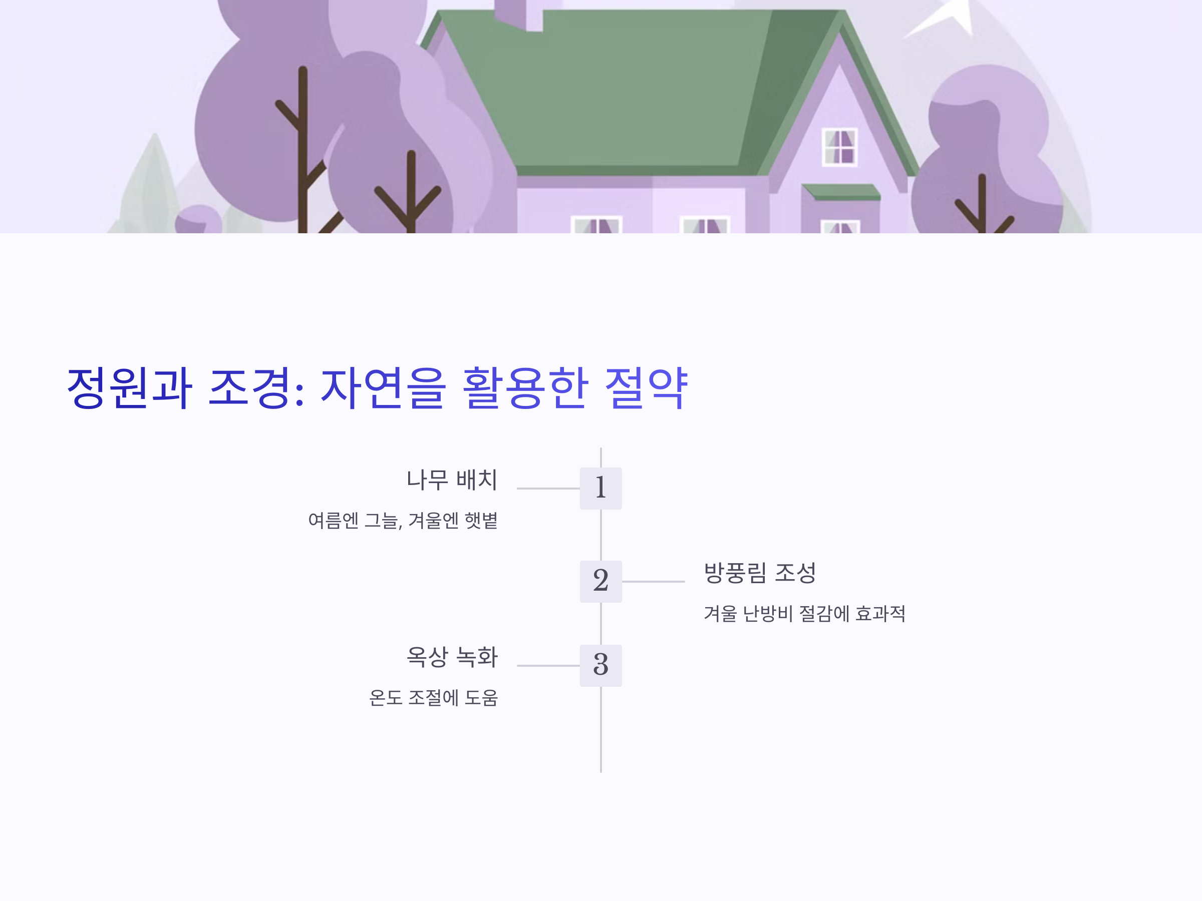 - 낮은 방향의 나무 심기: 여름철에는 직사광선을 막고, 겨울철에는 햇볕을 받을 수 있도록 나무를 적절히 배치합니다.