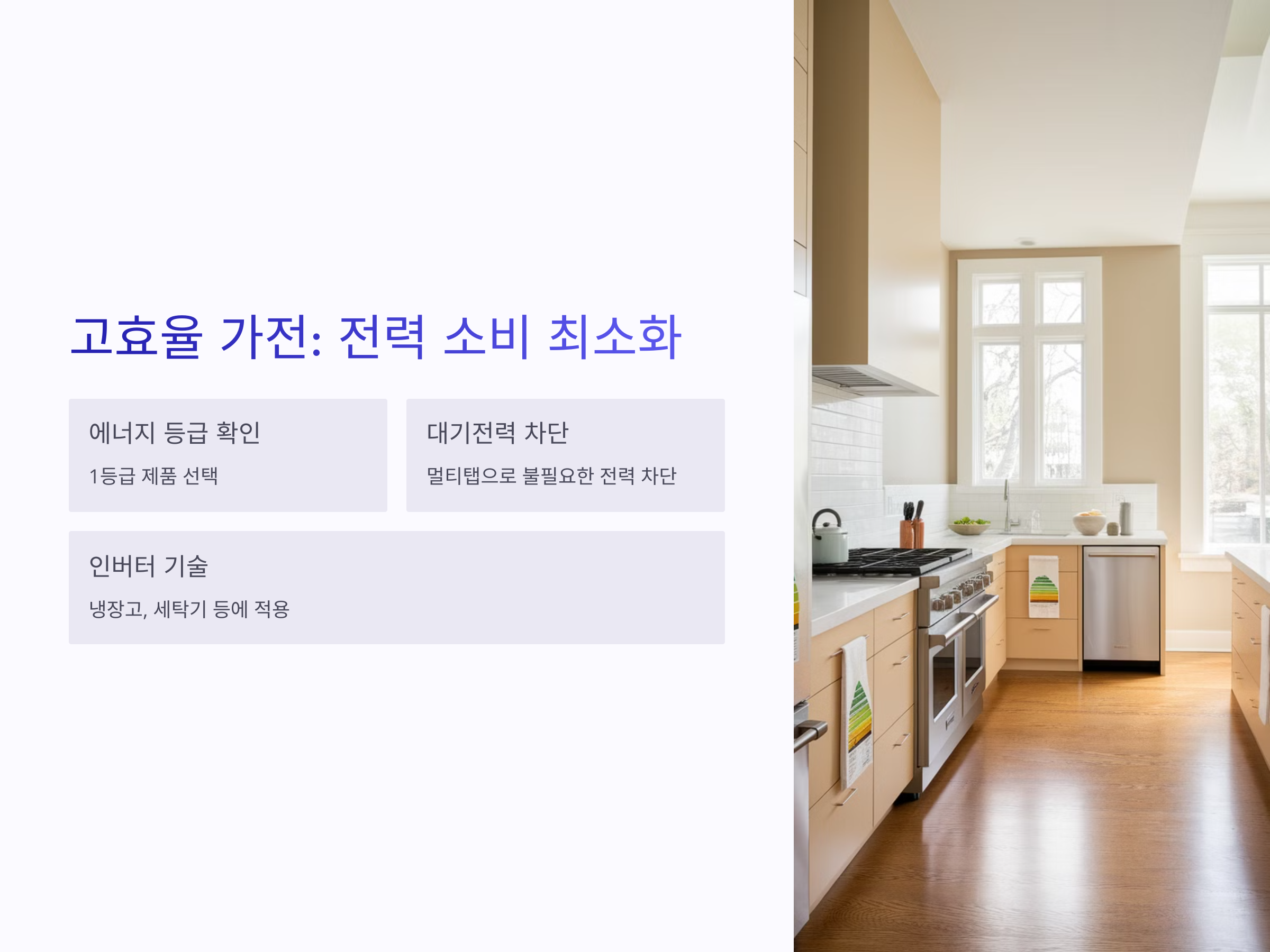 - 인버터 기술이 적용된 제품 선택: 냉장고, 세탁기, 에어컨 등은 인버터 기술이 적용된 제품을 선택하면 에너지 효율이 높아집니다.