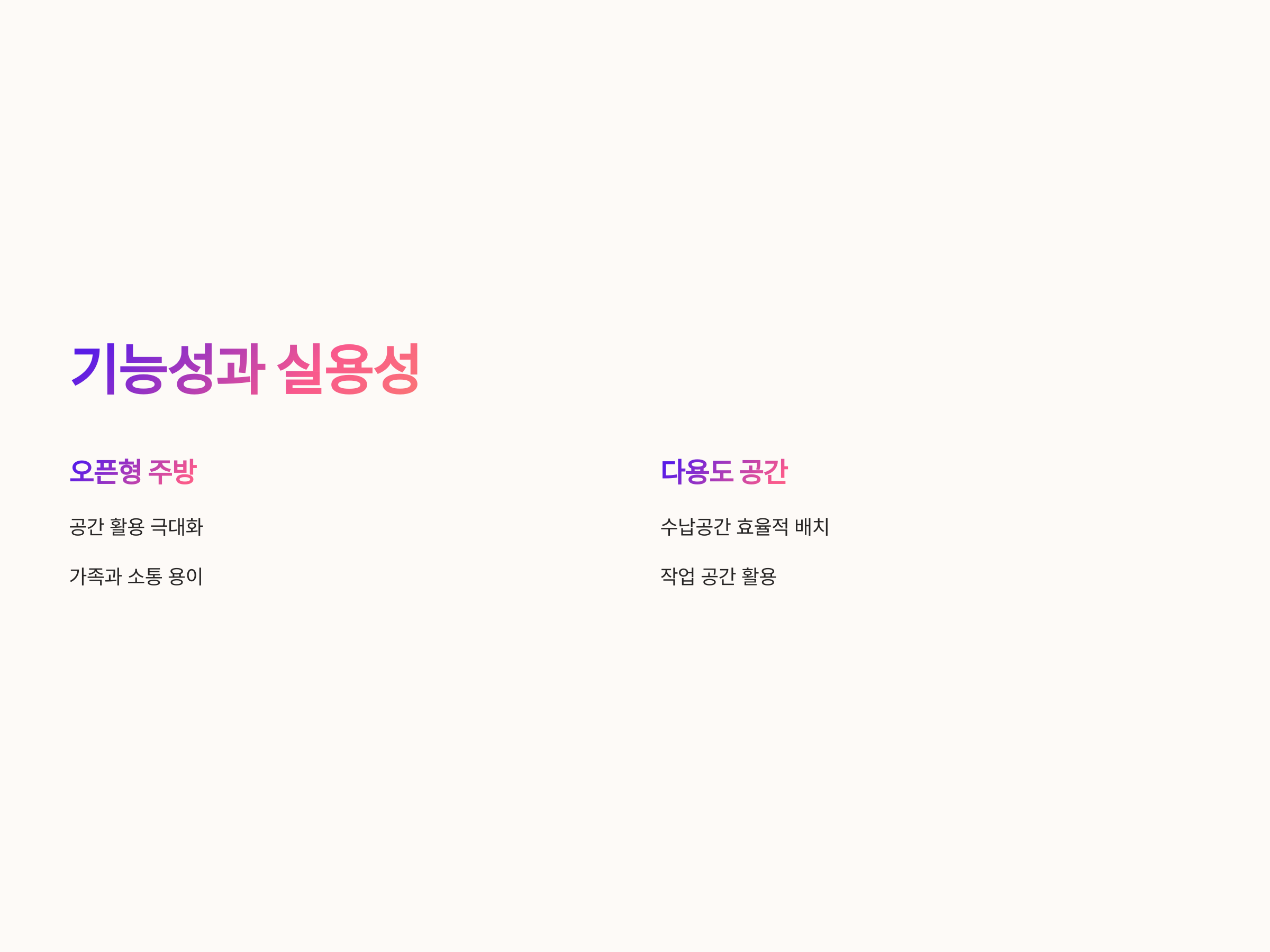 - 오픈형 주방을 통해 공간을 넓게 활용하고, 자연광을 최대한 받는 설계를 하는 것이 좋습니다.