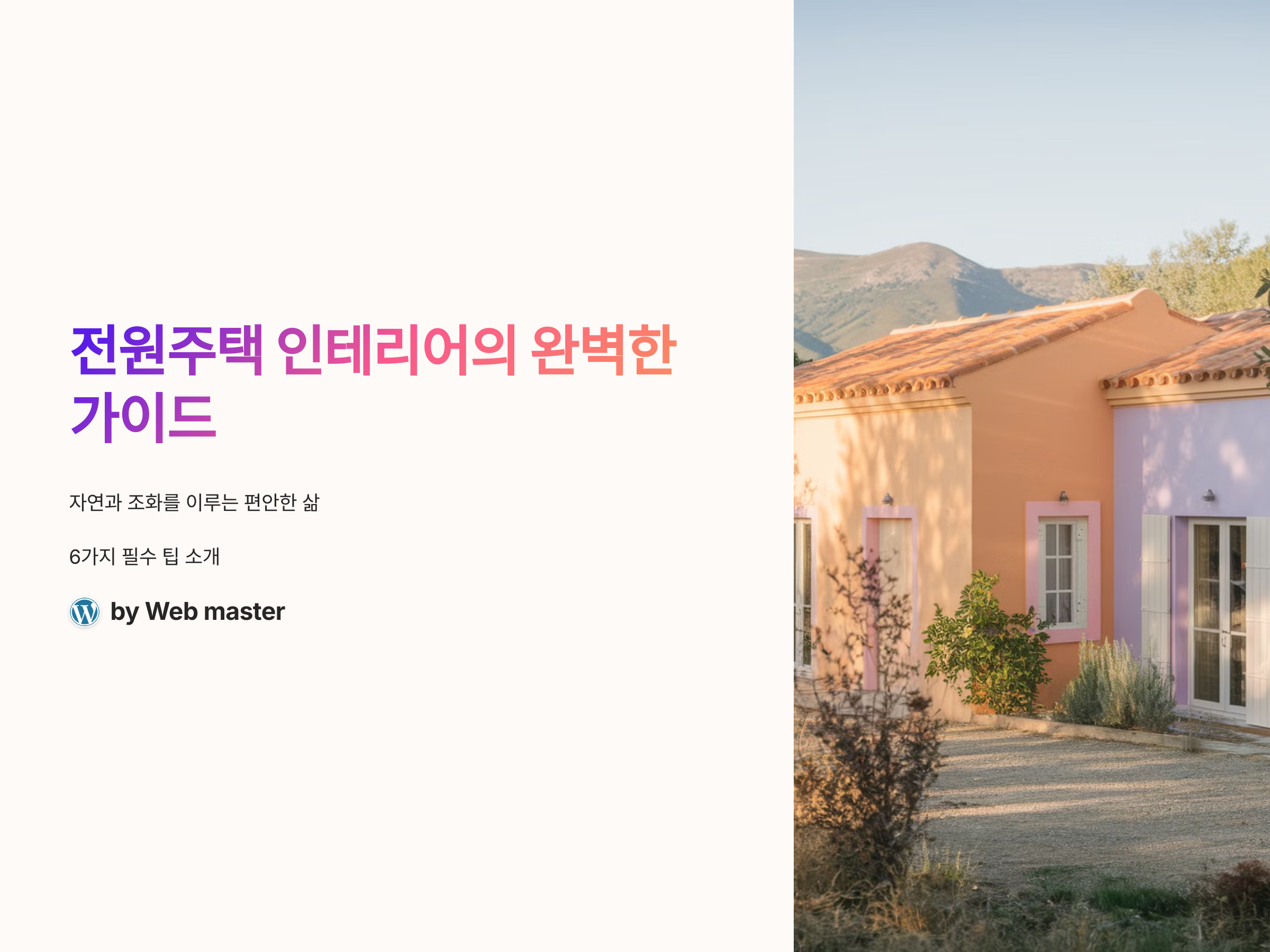 전원주택 인테리어는 자연과의 조화를 이루는 것이 핵심입니다. 나무, 돌, 그리고 자연적인 색상으로 실내를 꾸미고, 기능성과 실용성을 고려하여 편안한 생활을 누릴 수 있습니다. 여러 스타일 중에서 자신에게 맞는 스타일을 선택하고, 작은 소품으로 마무리하는 것까지 신경 써서 집을 꾸민다면, 평화로운 전원주택 생활을 더 잘 즐