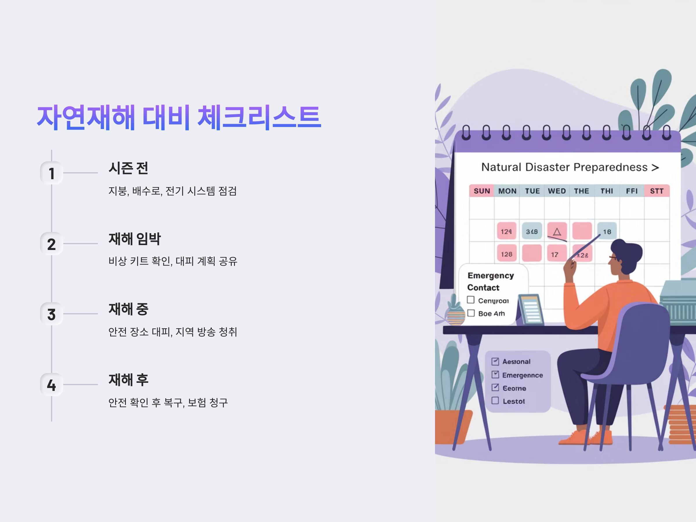 자연재해에 대한 사전 준비와 주기적인 점검을 통해 평온한 일상을 유지하고, 재난이 발생했을 때 침착하게 대응할 수 있도록 준비하세요.