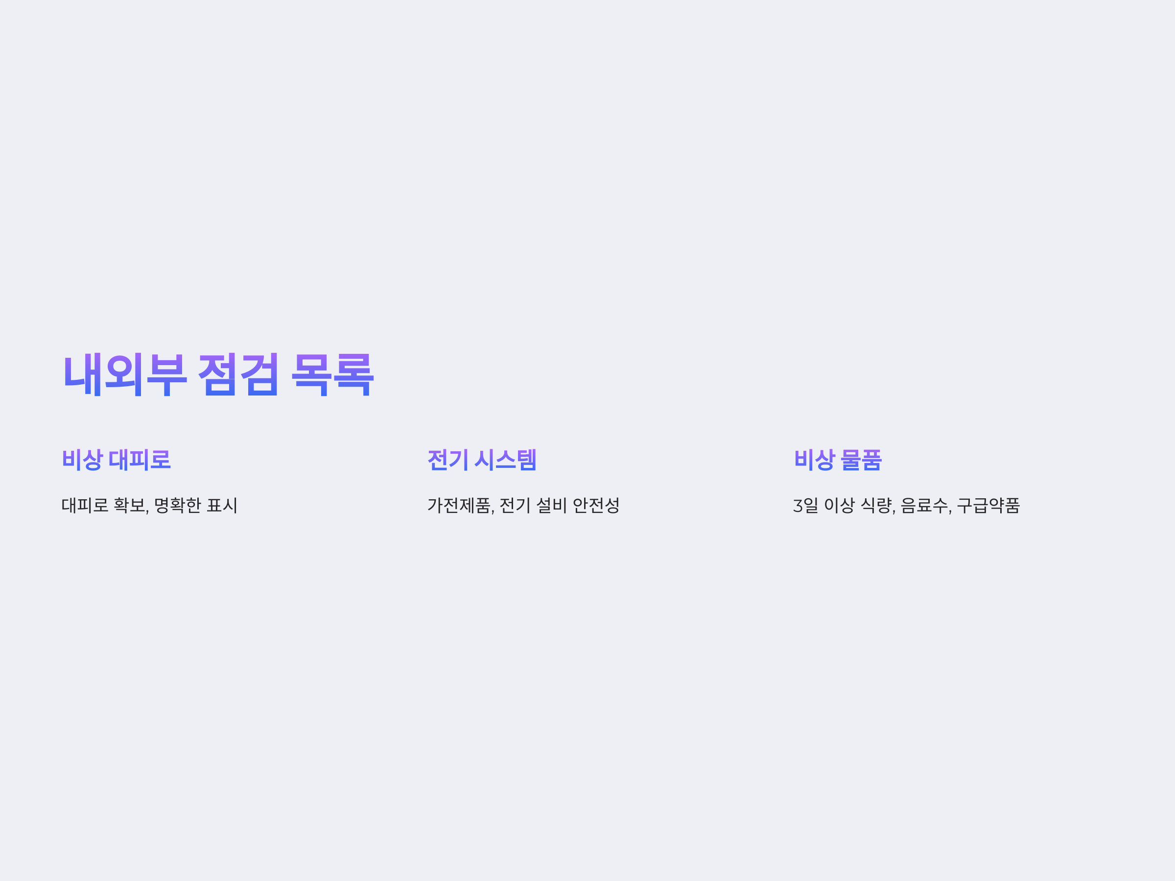 - 비상 대피로 확보: 대피로가 막히지 않도록 물건을 정리하고, 비상 대피로를 명확히 표시합니다.