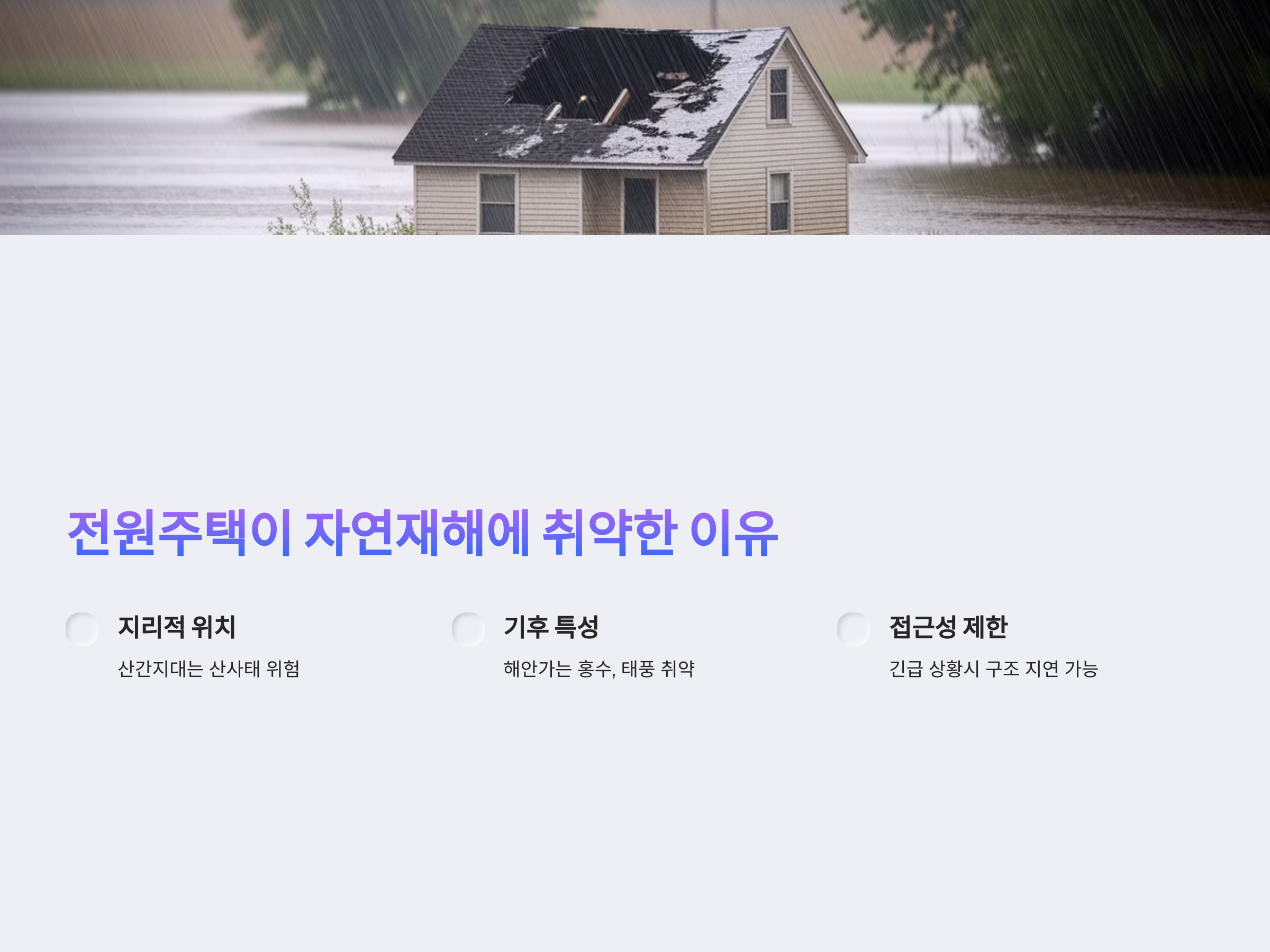 전원주택은 도시의 아파트와는 다른 환경에서 거주하는 만큼 자연재해에 더 취약할 수 있습니다. 바람이 많이 불거나, 강수량이 많은 지역에서는 특히 자연재해의 위험이 커집니다. 전원주택이 위치한 지역의 기후 특성과 지형을 고려한 사전 대비가 중요합니다.
