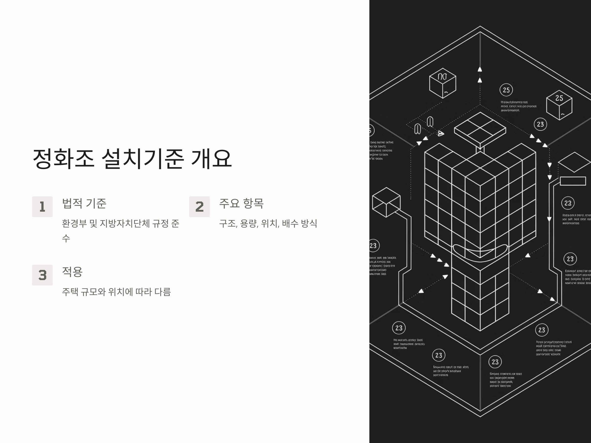 정화조의 설치 기준은 크게 구조적 요구사항, 용량, 설치 위치, 배수 방식 등에 대한 규정을 포함합니다. 각 항목에 대해 구체적으로 알아보겠습니다.