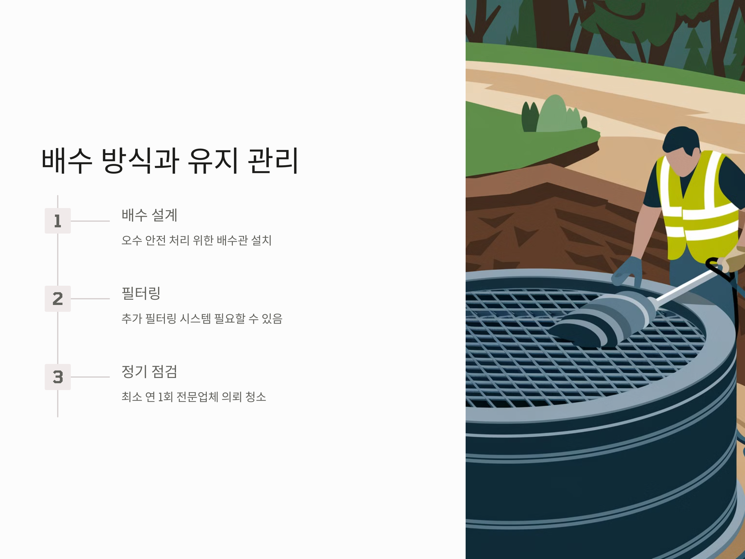 배수 방식은 정화조의 설치 시 중요한 고려사항 중 하나입니다. 오수가 처리된 후 배수 방식에 따라 깨끗한 물이 자연으로 흘러갈 수 있도록 설계해야 합니다. 이를 위해서는 배수관을 통해 오수를 안전하게 처리해야 하며, 정화조의 구조에 따라 일부는 추가적인 필터링 시스템이 필요할 수도 있습니다.