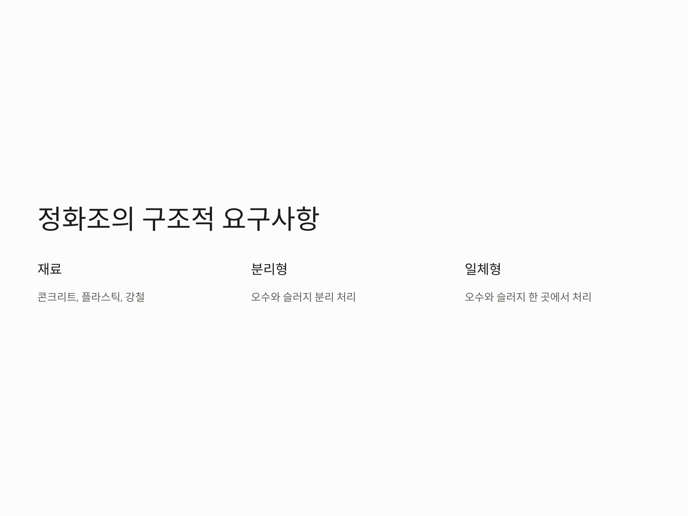 - 일체형 정화조는 오수와 슬러지가 한 곳에서 처리되는 방식으로, 상대적으로 설치가 간편합니다.
