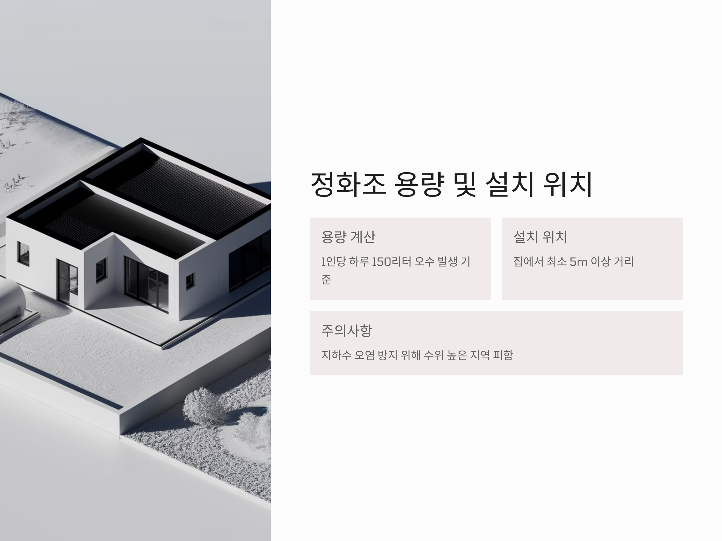 정화조 용량은 주택의 인원 수에 따라 계산합니다. 1인당 하루 약 150리터의 오수가 발생한다고 보고, 인원 수에 맞춰 적절한 용량을 선택해야 합니다.