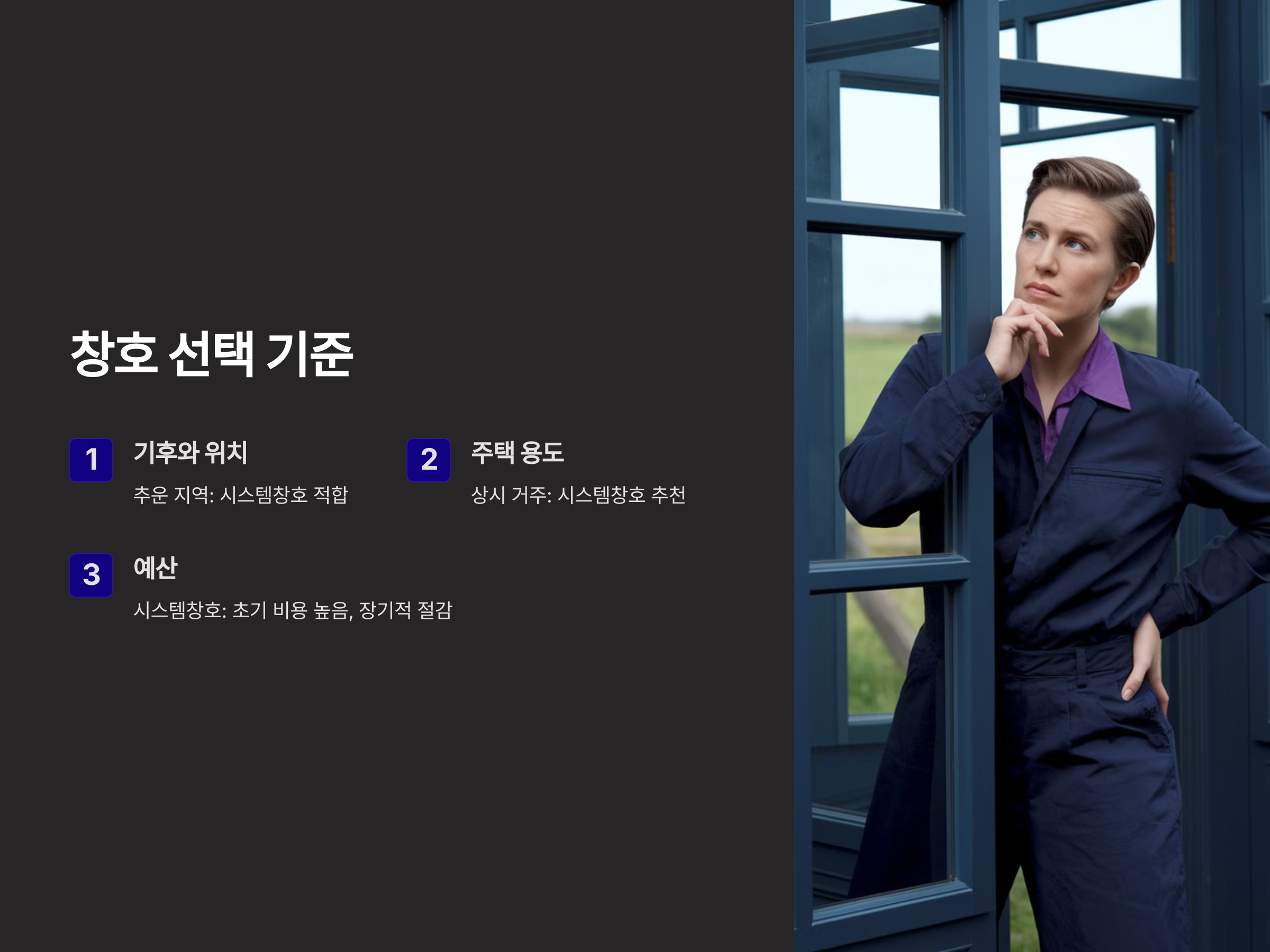 - 기후와 위치: 추운 지역에서는 열 손실을 최소화하기 위해 시스템창호가 적합합니다. 온화한 지역에서는 이중창도 충분한 효율을 발휘할 수 있습니다.