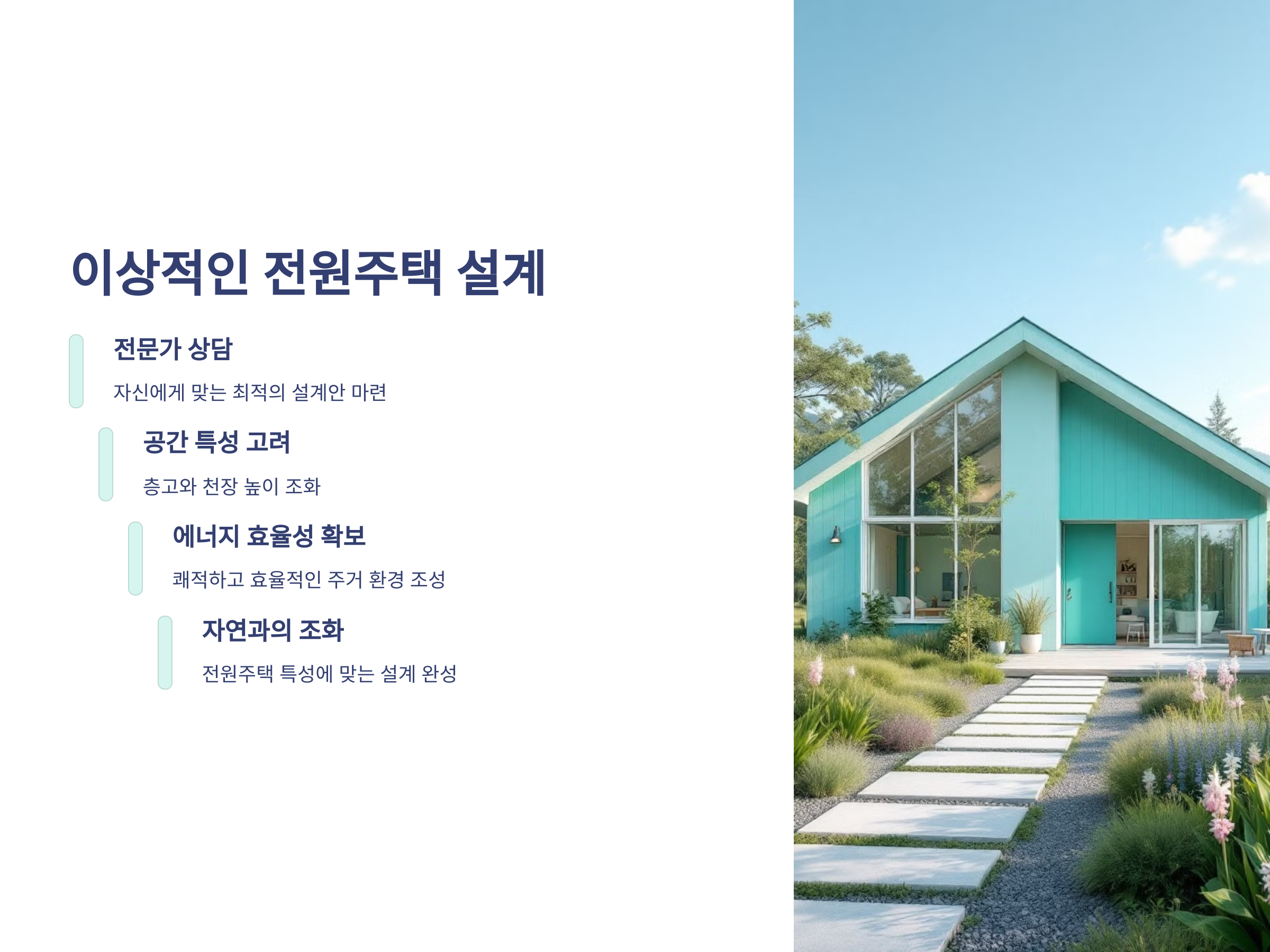 전원주택을 설계하는 데 있어 층고와 천장의 높이는 매우 중요한 역할을 합니다. 적절한 설계를 통해 공간의 느낌을 조정하고, 에너지 효율성을 극대화할 수 있습니다. 특히 전원주택의 특성을 고려한 설계는 자연과의 조화와 효율적인 공간 활용을 가능하게 해줍니다.