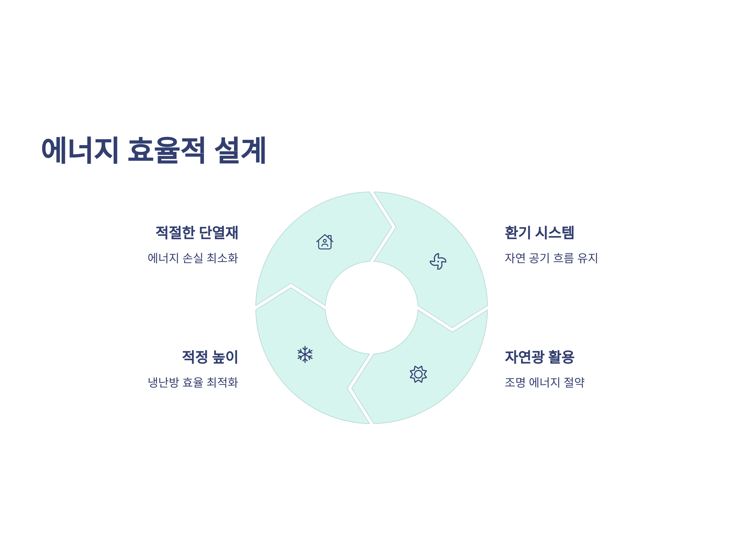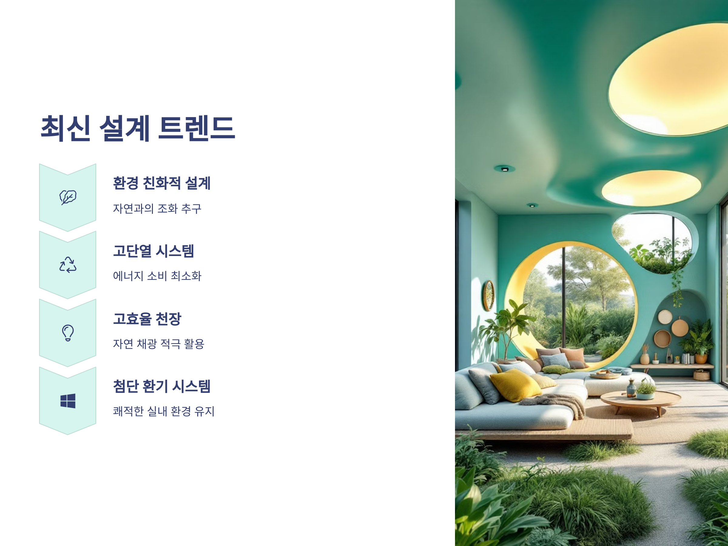 에너지 효율성을 고려한 설계는 주로 고단열, 고효율 천장 시스템, 자연 채광을 적극적으로 활용하는 방식으로 발전하고 있습니다. 또한, 창호 및 환기 시스템을 설계하여 에너지 소비를 줄이면서도 자연 환경과의 조화를 이루는 방향으로 설계가 이루어지고 있습니다.