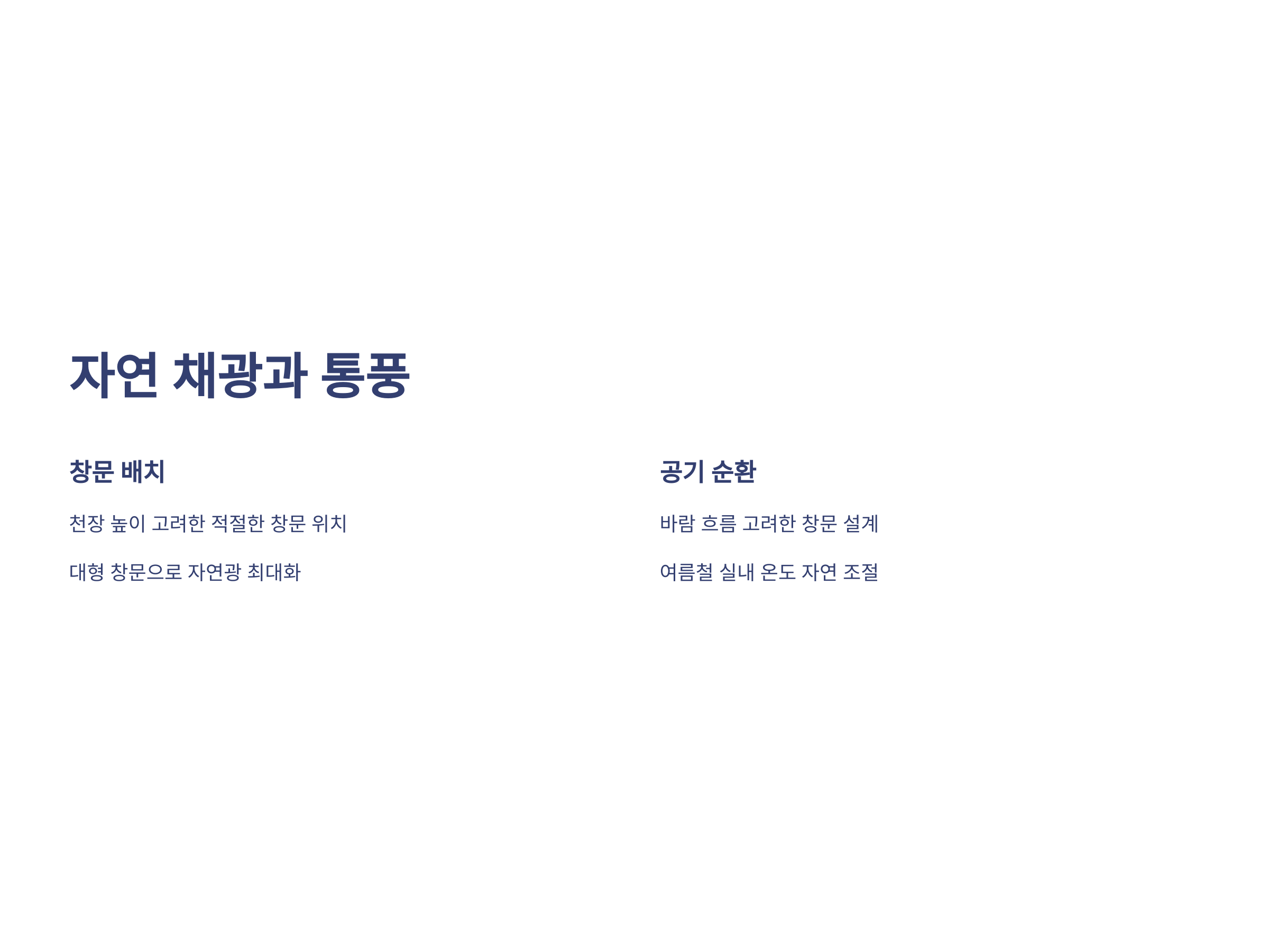 예를 들어, 천장을 높게 설계하고 대형 창문을 배치하면, 자연광이 더욱 잘 들어오며 실내가 환해집니다. 또한, 창문을 잘 배치하여 바람이 자연스럽게 순환되도록 설계하면, 여름철에는 시원한 바람이 들어와 실내 온도를 낮출 수 있습니다.