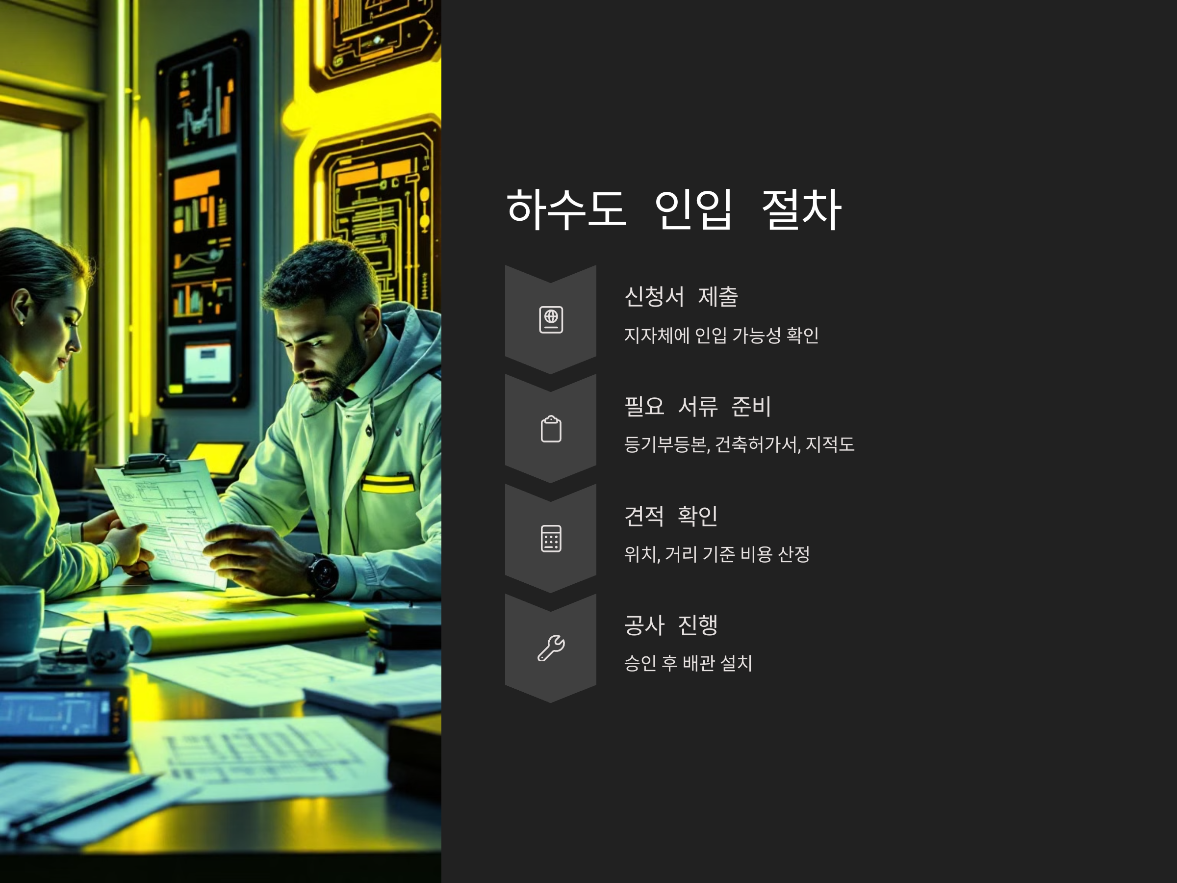 하수도 인입을 위한 서류로는 보통 부동산 등기부등본, 건축 허가서, 지적도 등이 필요합니다. 또한, 공공 하수도에 연결하려면, 연결 가능한 지점까지의 거리나 공사 난이도 등을 기준으로 한 추가적인 서류나 신청서도 필요할 수 있습니다. 이를 미리 준비하여 빠르게 진행할 수 있도록 하는 것이 중요합니다.