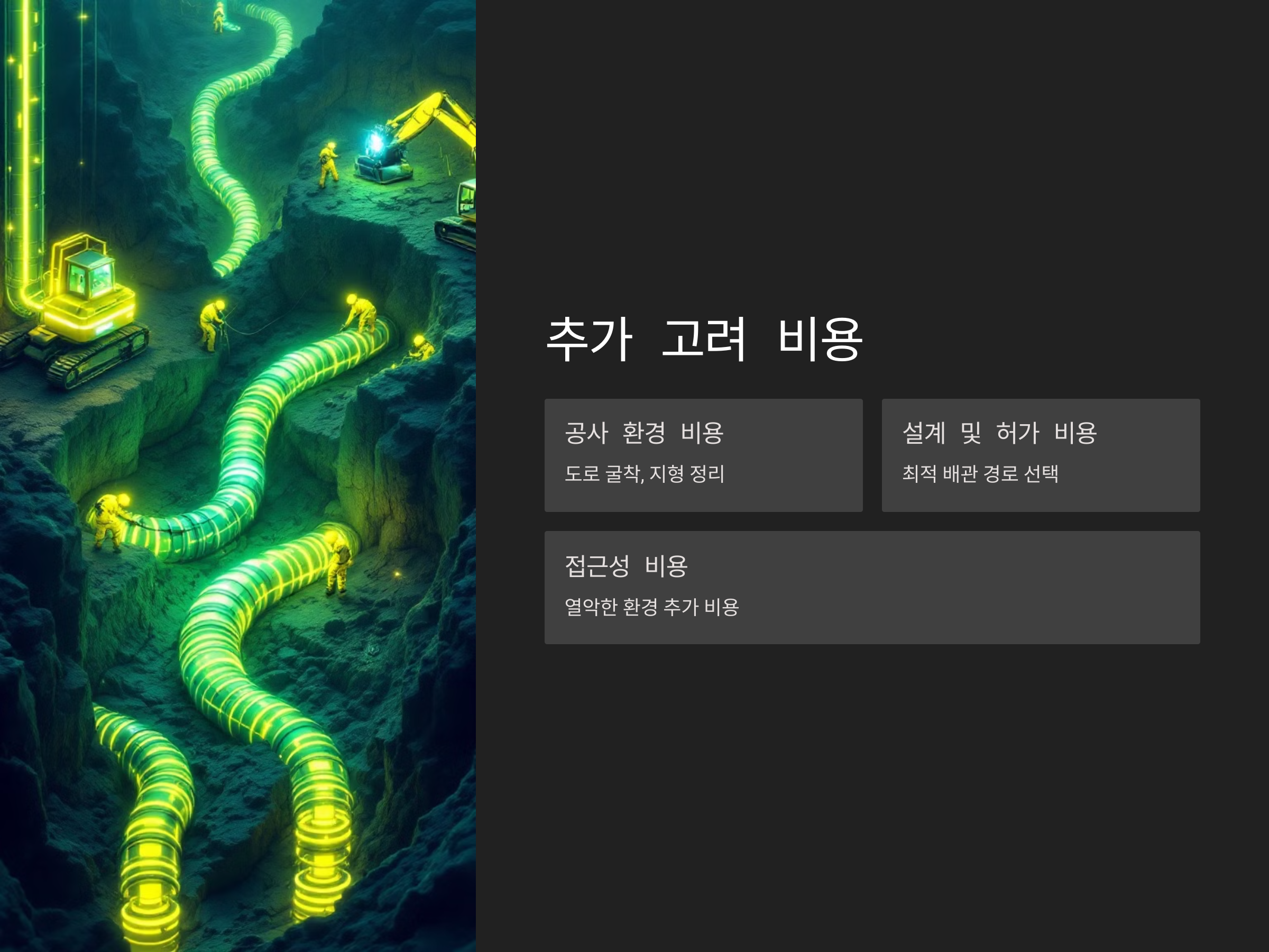 하수도 인입은 단지 하수도 배관을 설치하는 것 외에도 여러 가지 비용이 추가로 발생할 수 있습니다. 예를 들어, 하수도를 인입하기 위해서는 도로를 파고, 지형을 고르고, 물이 잘 흐르도록 설계해야 하기 때문에 공사 비용이 생각보다 많이 들 수 있습니다. 특히, 공사 환경이 열악하거나 접근이 어려운 지역에서는 이 비용이 더 커질 수 있습니다.