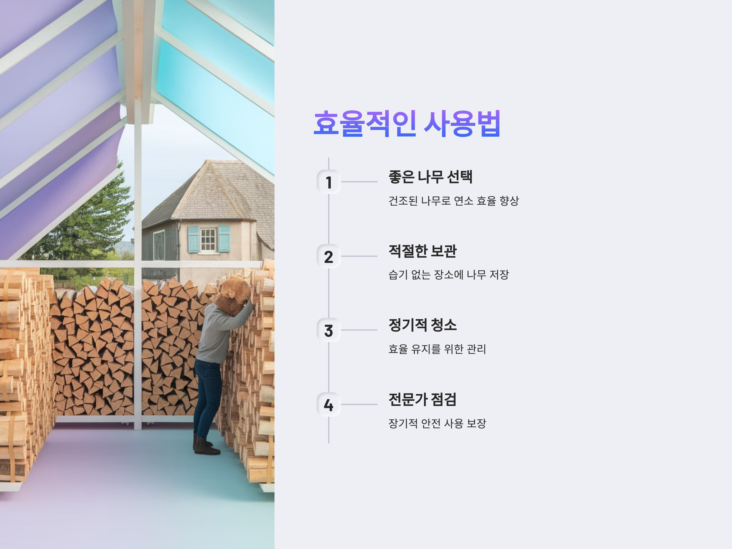 그리고 연료의 구입과 보관이 번거롭다는 점도 단점으로 꼽힙니다. 나무를 연료로 사용하려면 미리 확보해 두어야 하며, 이를 건조시킬 공간도 필요합니다. 또한, 나무를 보관하는 과정에서 발생할 수 있는 습기나 곰팡이 문제도 고려해야 합니다.