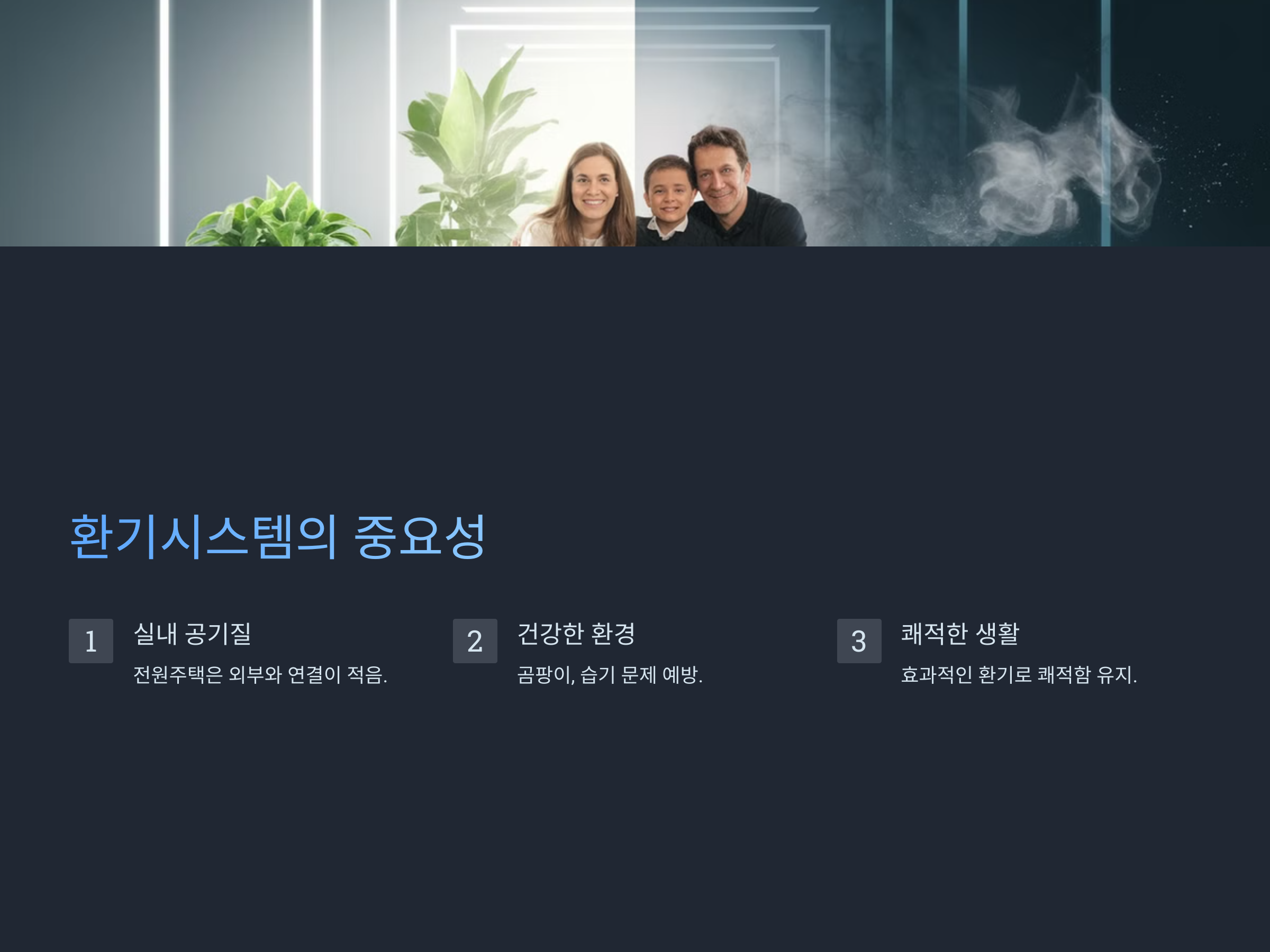 전원주택에 적합한 환기 시스템을 선택하는 것은 단순히 공기 흐름을 조절하는 문제가 아니라, 에너지 효율성, 유지 관리, 설치 비용 등을 모두 고려해야 합니다. 각 환기 시스템의 특성을 정확히 이해한 후, 자신의 주택 환경과 생활 패턴에 맞는 시스템을 선택하는 것이 중요합니다.