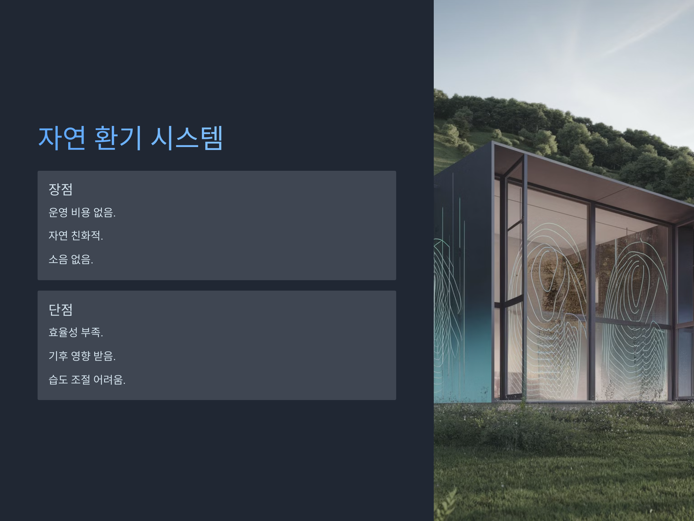 - 효율성 부족: 기후나 바람의 세기에 따라 환기 효율이 달라지므로, 일관된 환기가 어려울 수 있습니다.