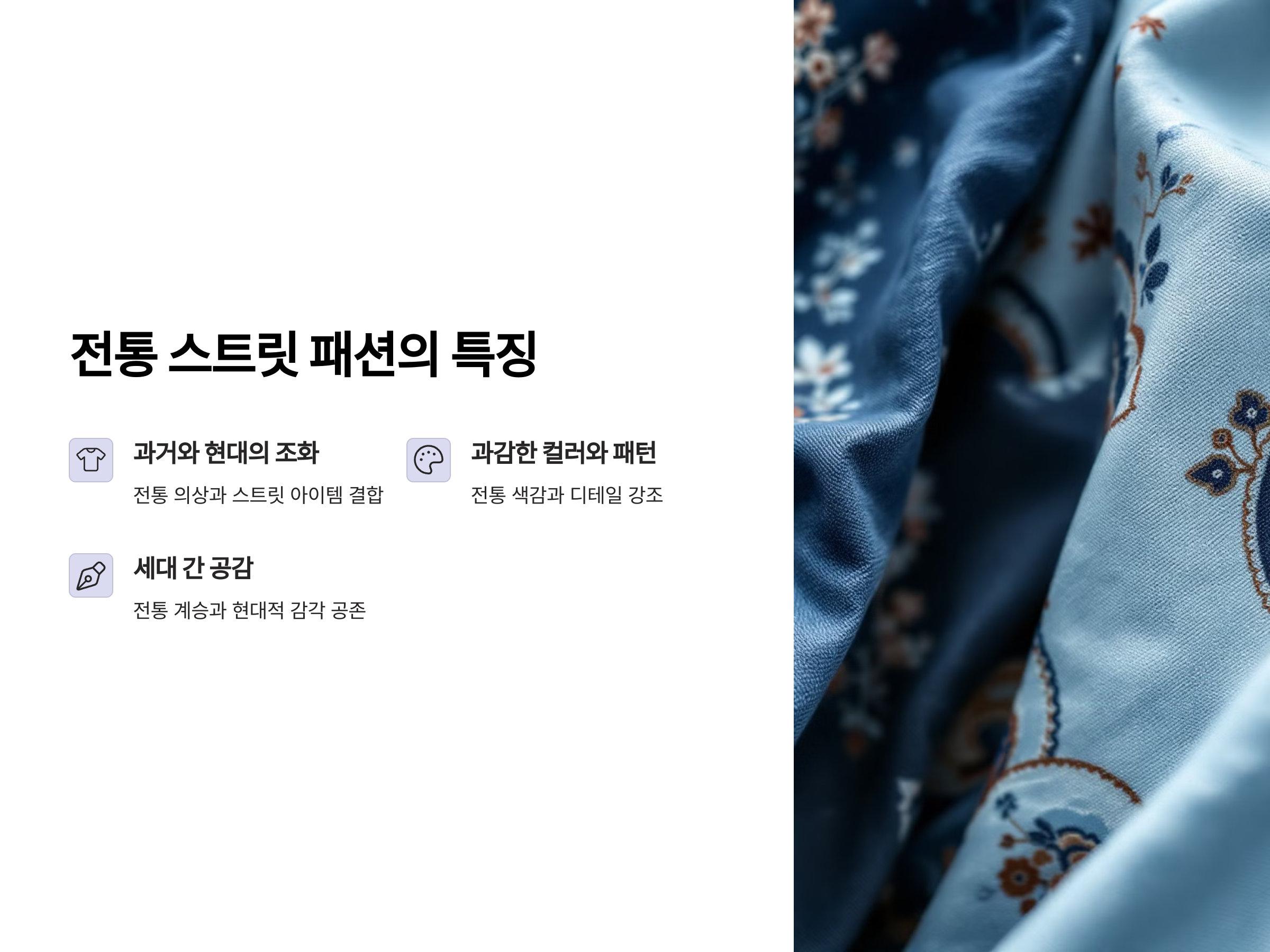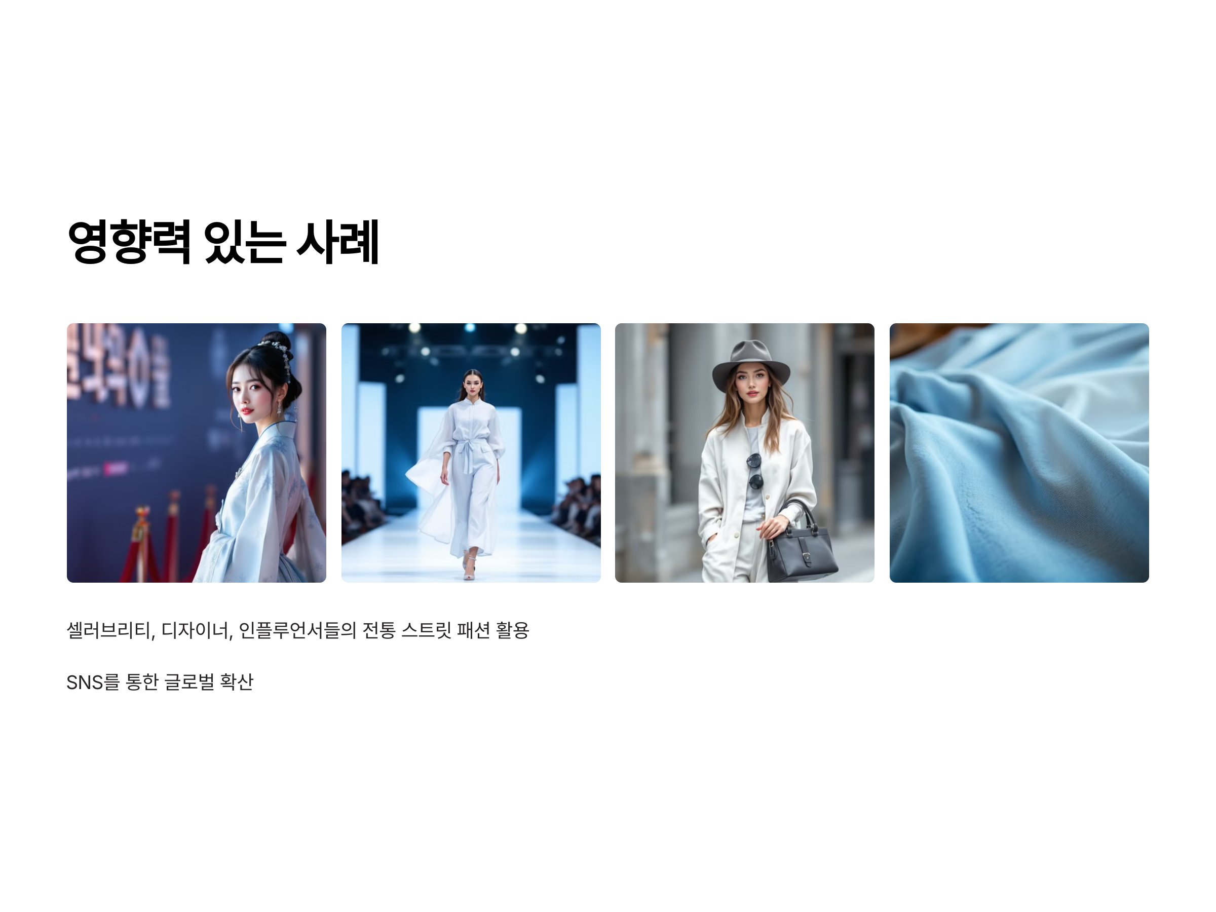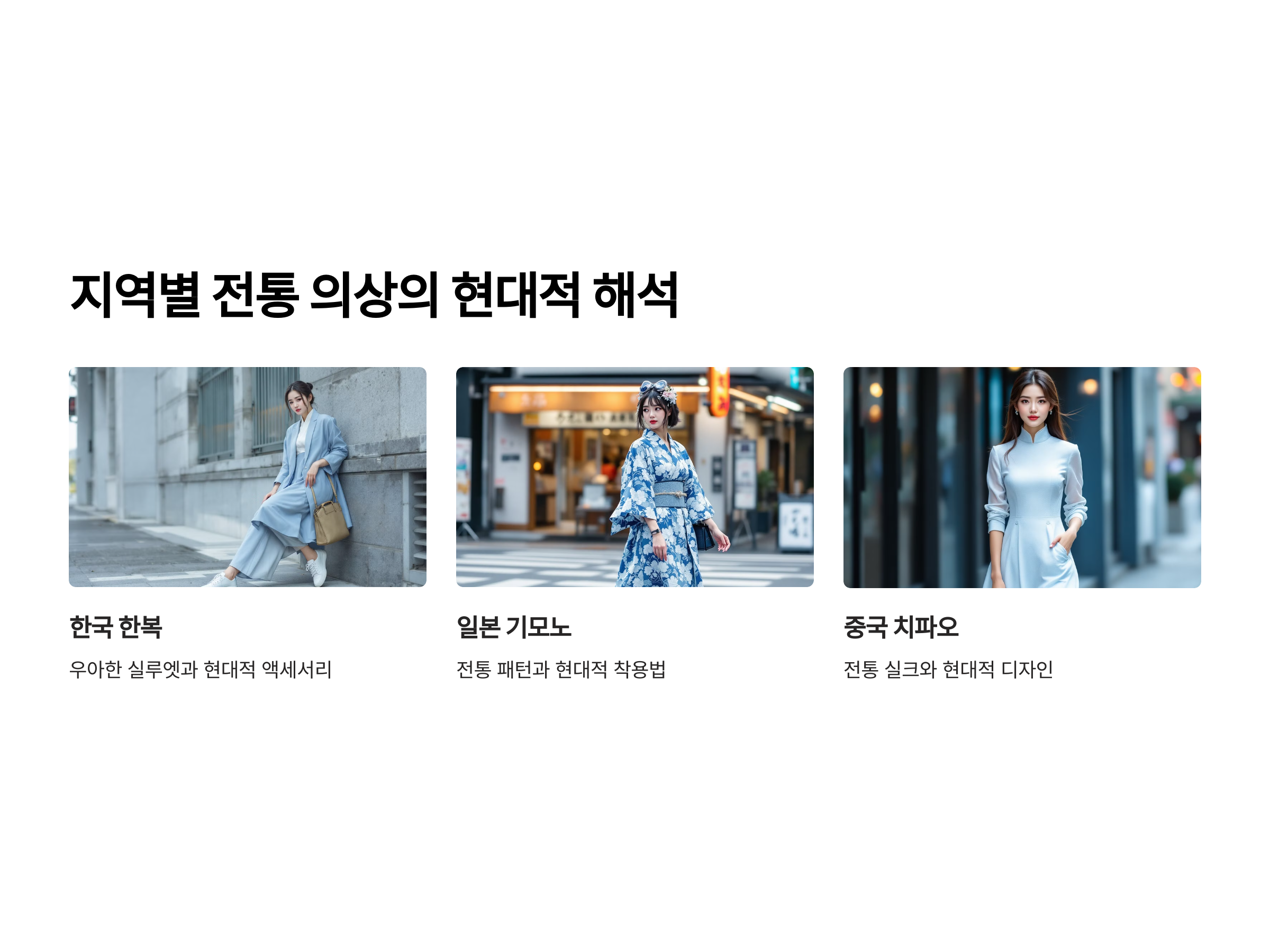 전통 스트릿 패션은 그 자체로 문화적 의미를 내포하고 있습니다. 예를 들어, 한국의 한복을 현대적이고 자유로운 스트릿 스타일로 재해석한 것부터 시작하여, 일본의 기모노나 중국의 전통적인 복식도 현대적인 감각으로 변형된 형태로 등장하고 있습니다. 이렇게 전통 의상에 현대적인 요소를 결합한 패션은 단순히 복고풍의 재현이 아니라, 과거와 현재를 잇는 독창적인 패션의 흐름을 만들어냅니다.